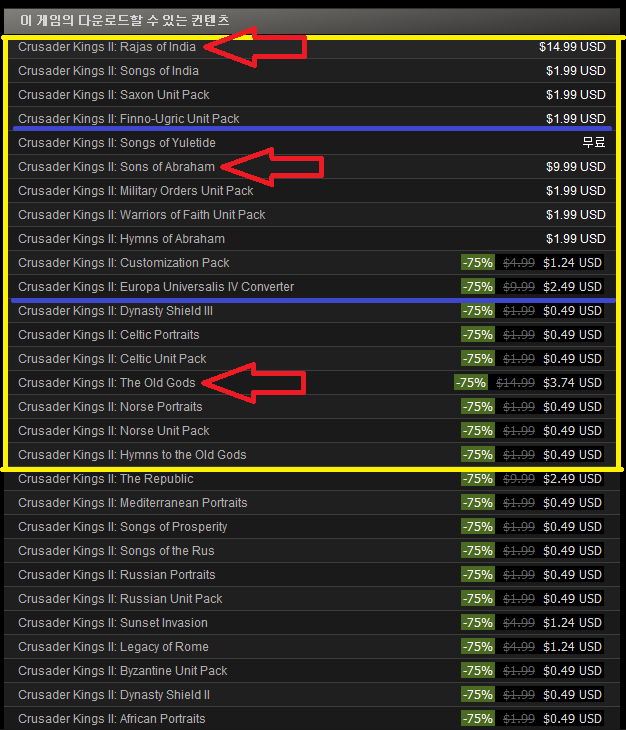 노란색 박스 안이 CK2 Collection에서 미포함 된 DLC들로 각자 기호에 따라 구입하시면 됩니다.