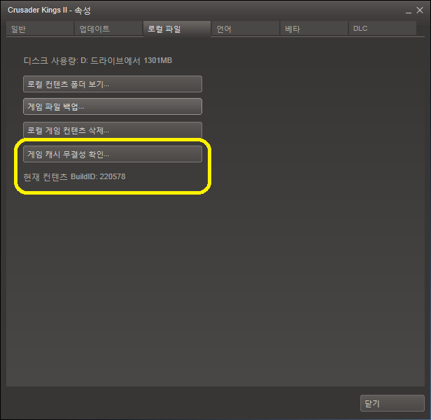 : 속성 창에서 '로컬파일'=>'게임케시 무결성 확인'