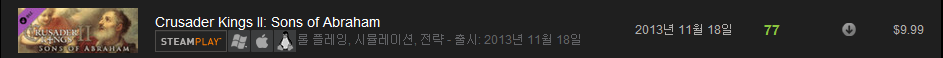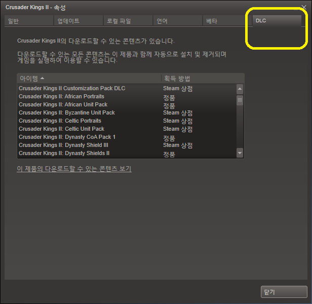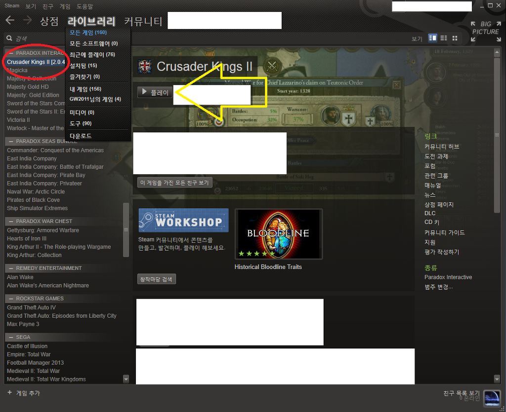 : '라이브러리'=>'모든게임'=>좌측 빨간원 창에서 'CrusaderKings2'를 찾아 클릭하면, 위와 같은 화면이 나옵니다.