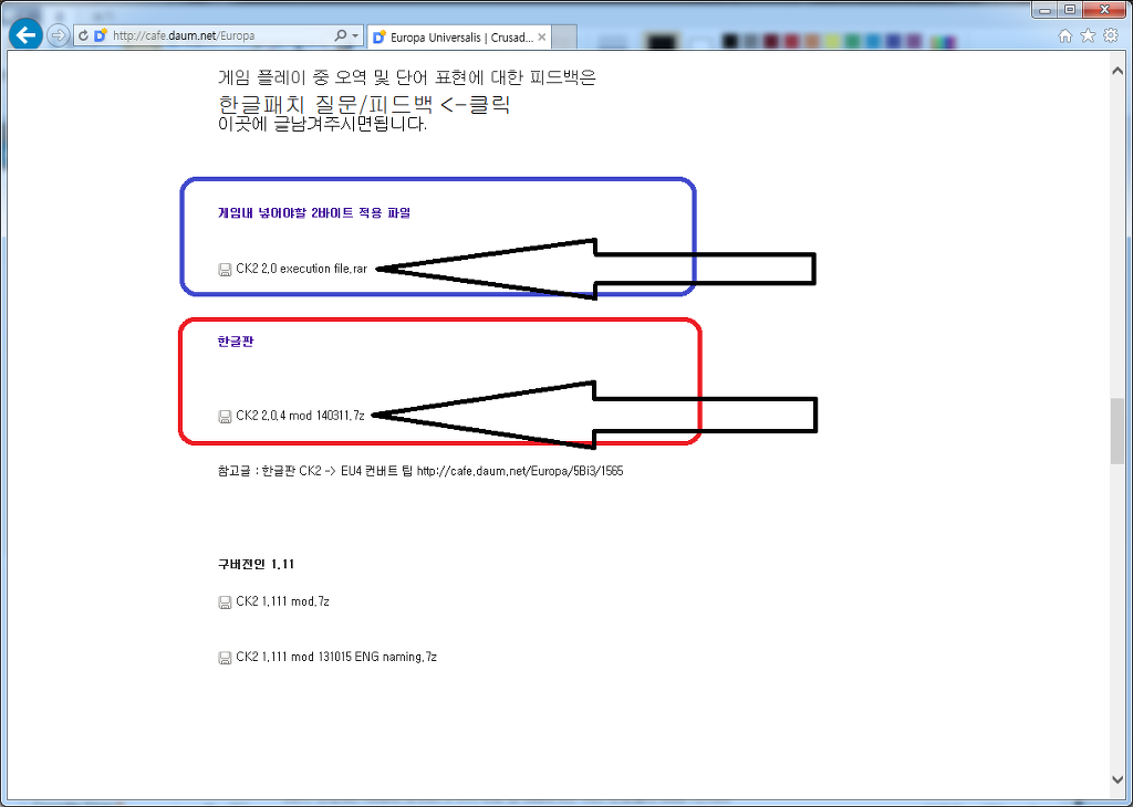 : 파란 원 안의 exe파일( CK2 2.0 execution file.rar )과