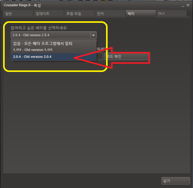 : 속성 창에서 '베타' => '2.0.4 - Old version 2.0.4' 클릭.