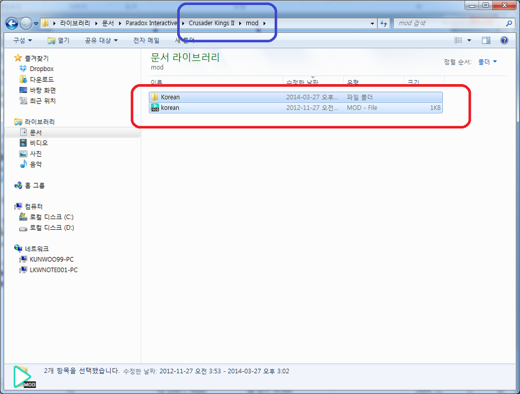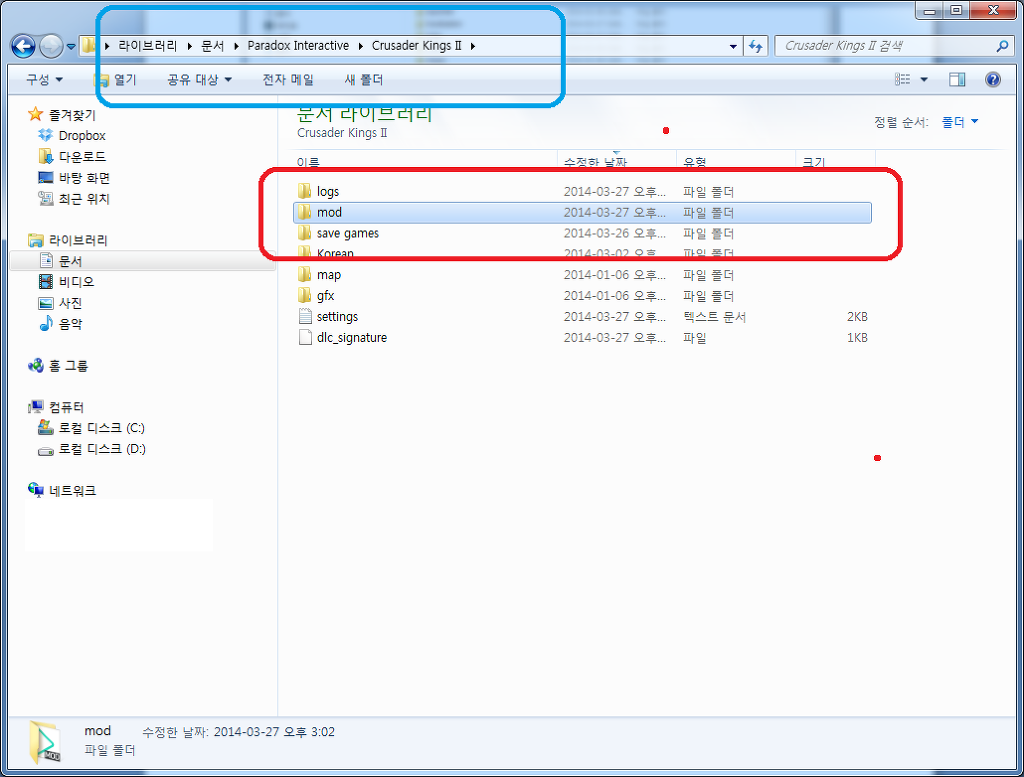 b. mod파일은 내문서 폴더 아래의 ck2폴더에서, mod폴더를 생성해주고 mod폴더 안에 복사해 줍니다.