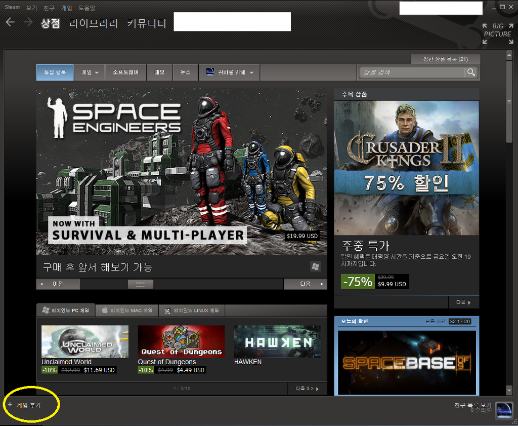 스팀이외에서 게임을 구매한 경우, 받은 게임코드를 등록하여 다운, 실행할 수 있습니다.