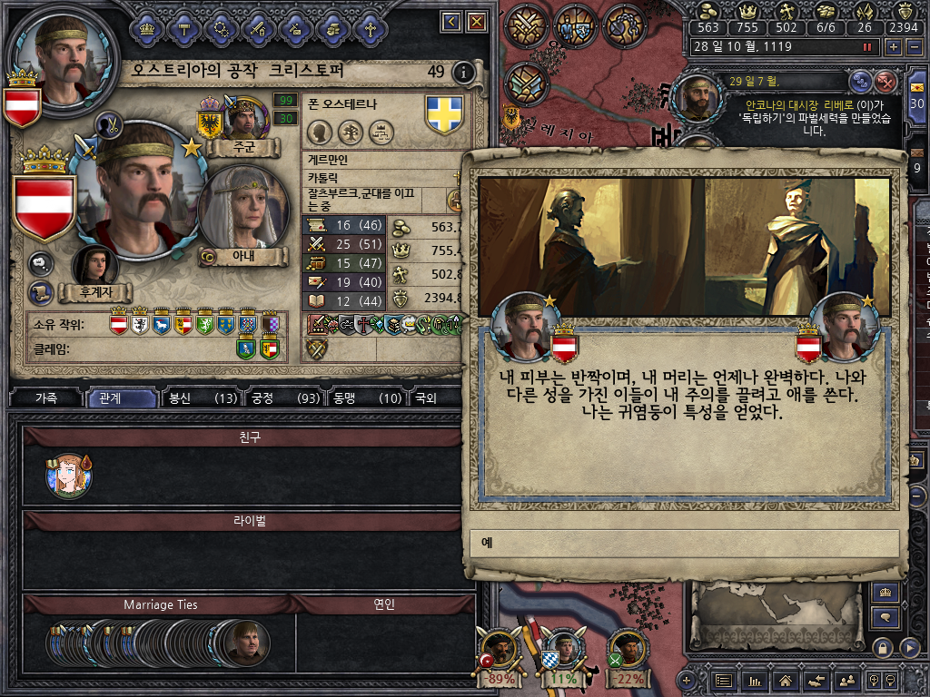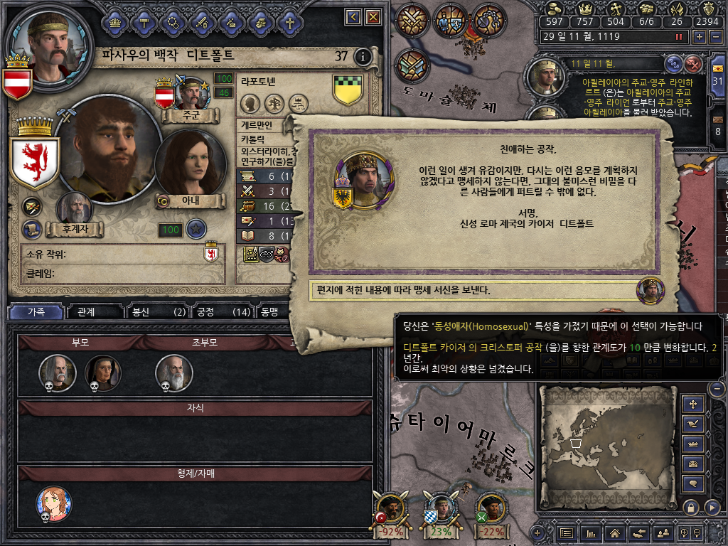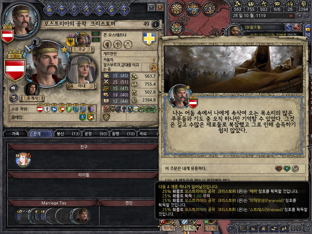 저 유사한 이벤트가 계속 반복해서 뜨는데 트레잇을 아무리 확인해도 호모섹슈얼 이외엔 흠잡을만한 트레잇이 없는데.........히든스탯으로 미치광이나 홀림을 달고 있는 게 아니었을까요 ㅋㅋㅋㅋㅋ