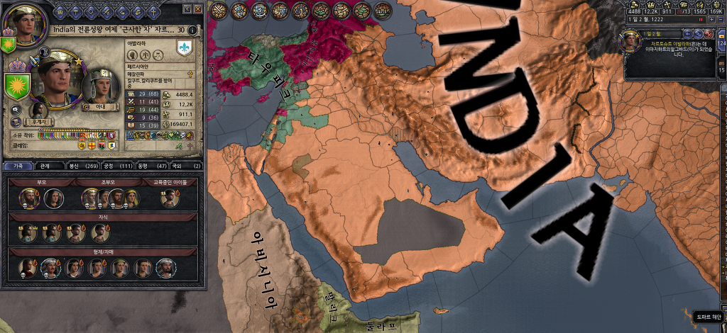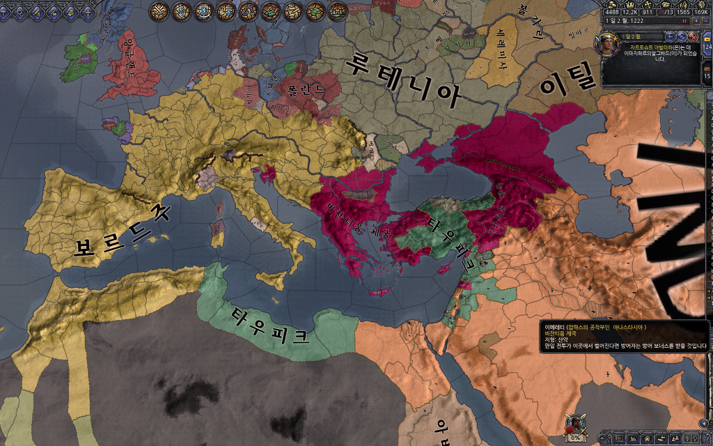 시아파 보르드주 왕조 히스파니아 제국이네요.. 저 어마어마한 영토인데, 퇴폐도 0%의 위엄을 자랑합니다.. (유저도 만들기 힘든 판도를..) 비잔틴 제국이 그동안 이슬람 세력의 동방 진출 (어?)을 막아주는 방파제 역할을 해주었지만, 계속 연패하는 모양이 이제는 한계에 다다른 모양입니다..