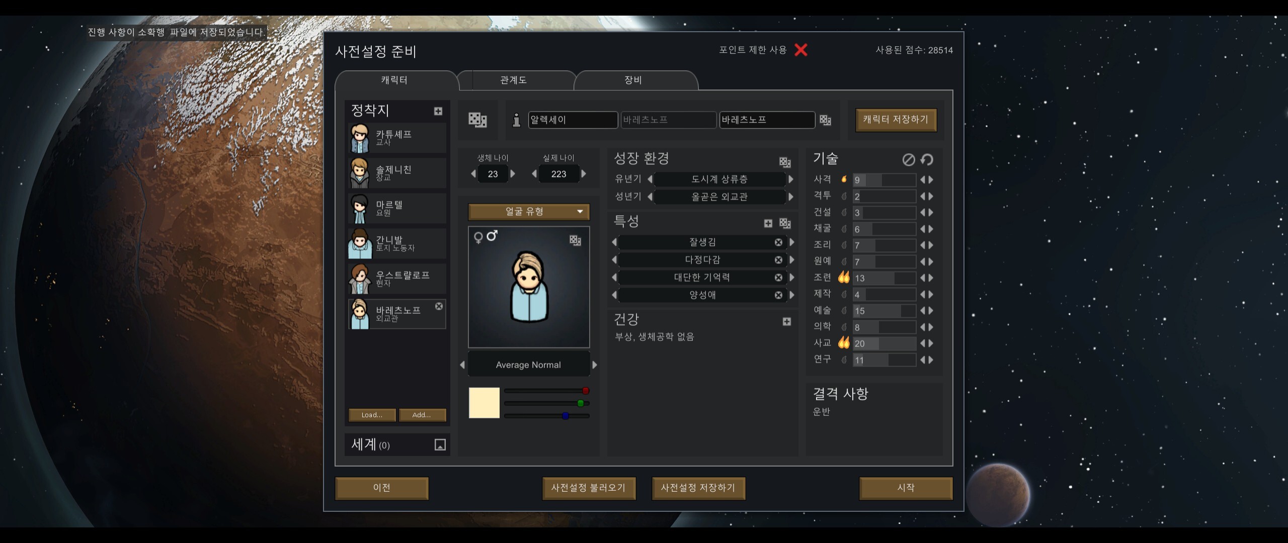 지난 9월 제가 참가했던 소비에트의 확장주의적 행보(소확행)의 인물들을 한번 림월드에서 현실화 시켜 개척단을 만들어 보았습니다. 능력치와 나이는 처음 만들었을때를 기본으로 하였으며 특성도 그에 따라 책정했고요.