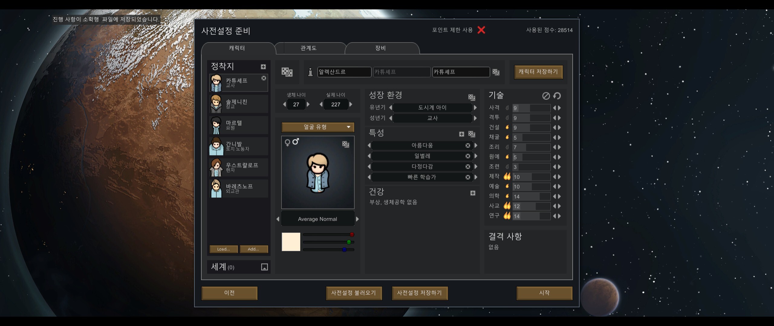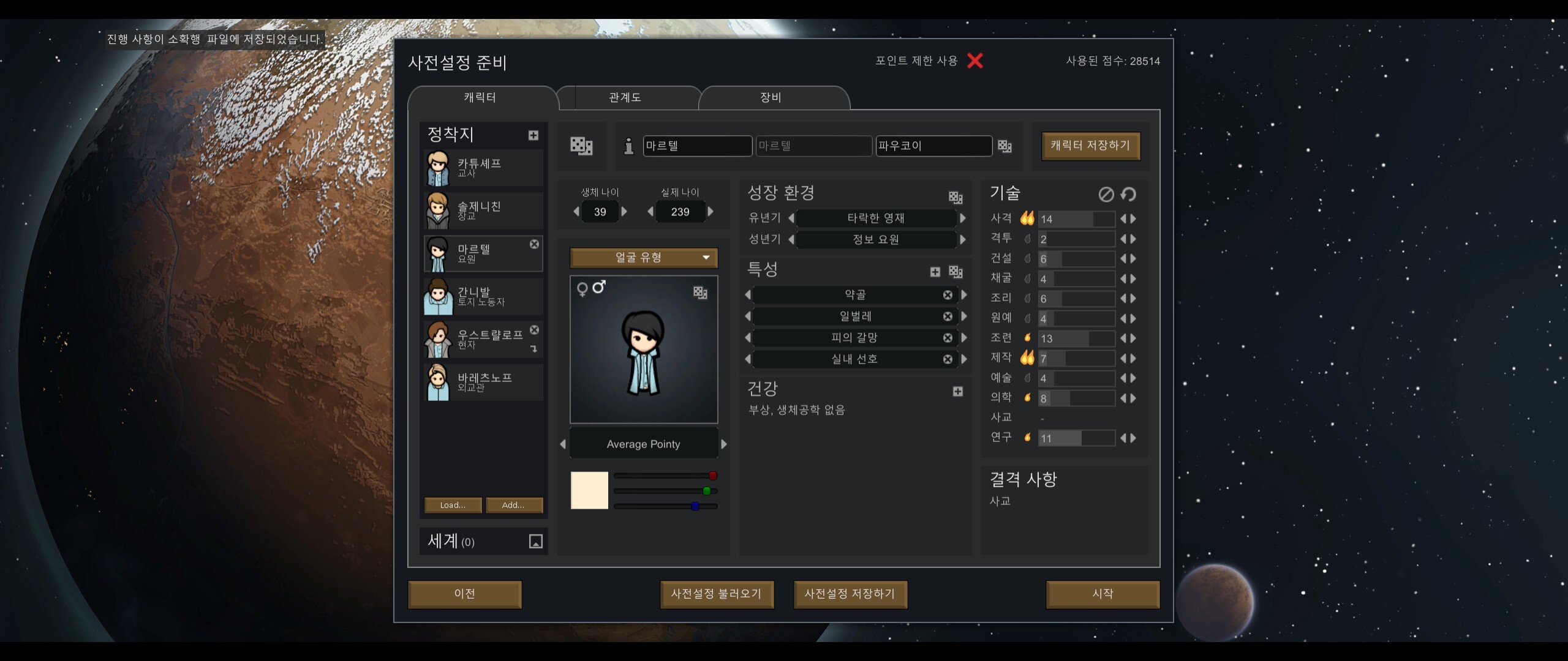 제가 인물들의 능력치나 트레잇, 배경 등을 최대한 반영하려고 했으나. 림월드 내에 없는 것들도 몇가지 있어서 100% 반영을 할 수는 없었네요. 그래도 재미있게 봐주세요. ㅎㅎ
