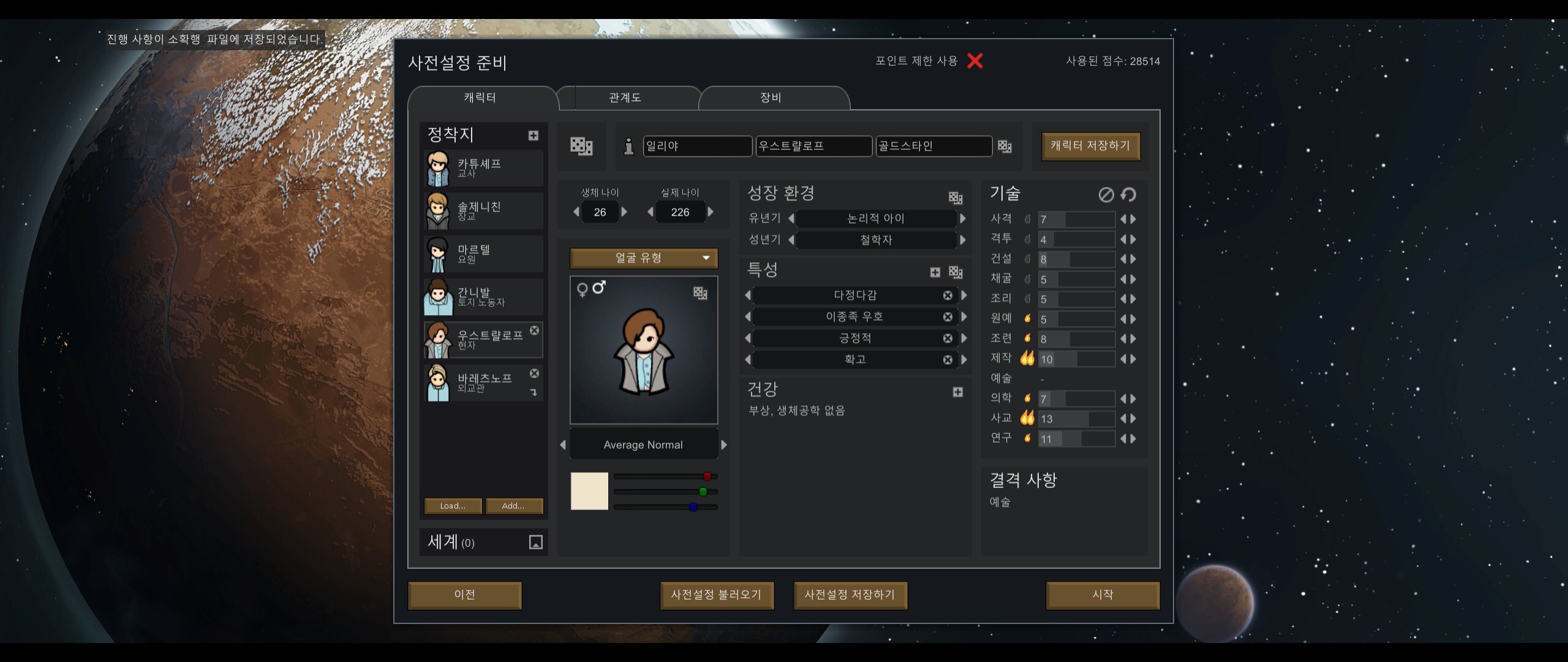 두번째로는 솔제니친입니다. 모든 능력치가 고르게 배분되어 개척단 내에서 만능 맥가이버 역할을 담당할 것 같습니다.