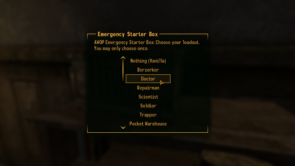 요건 모드로 설치한 IWS(몹 ㅈㄴ 늘리는 모드)에서 초반에 너무 힘드니 주는 보너습니다. 저는 의사양반이 좋으므로 가 아니고 체력이 초반에 후달릴거 같으므로 의사양반을 택합니다.