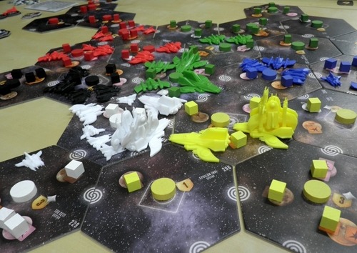 그 외에도 확장팩이 나왔습니다. 확장팩에서는 본판에서 있던 미사일의 먼치킨스러움을 덜어주기 위해 미사일디펜스 기술이 나왔고, 새로운 종족들이 추가되었으며 본판에서는 NPC로 취급받던 여러 탐험의 장애물(?)들이 스스로 움직이기도 합니다. 9명까지 플레이 가능한 것도 달라진 점이군요.