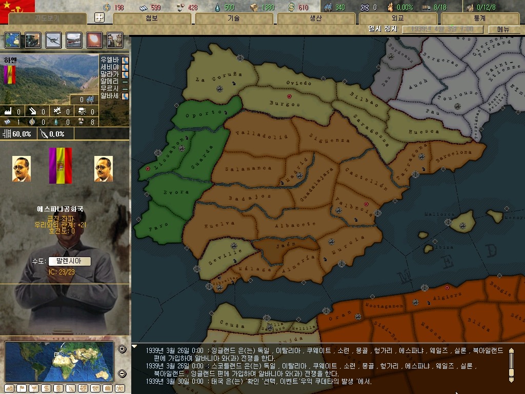 에스파냐 공화국이 승기를 잡고 있습니다. 하지만 중대한 변수 하나. 에스파냐는 세계 최강 추축국에 들어가 있습니다. 거기다 독일과 육로로 연결되 있죠(...)