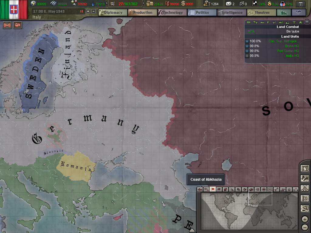 결국 직접 잡고 마이크로 컨트롤로 소련 밀었는데, 제가 민 부분이 전부 독일로 넘어갔습니다. ㅠㅠ 현자타임와서 HOI 종료.