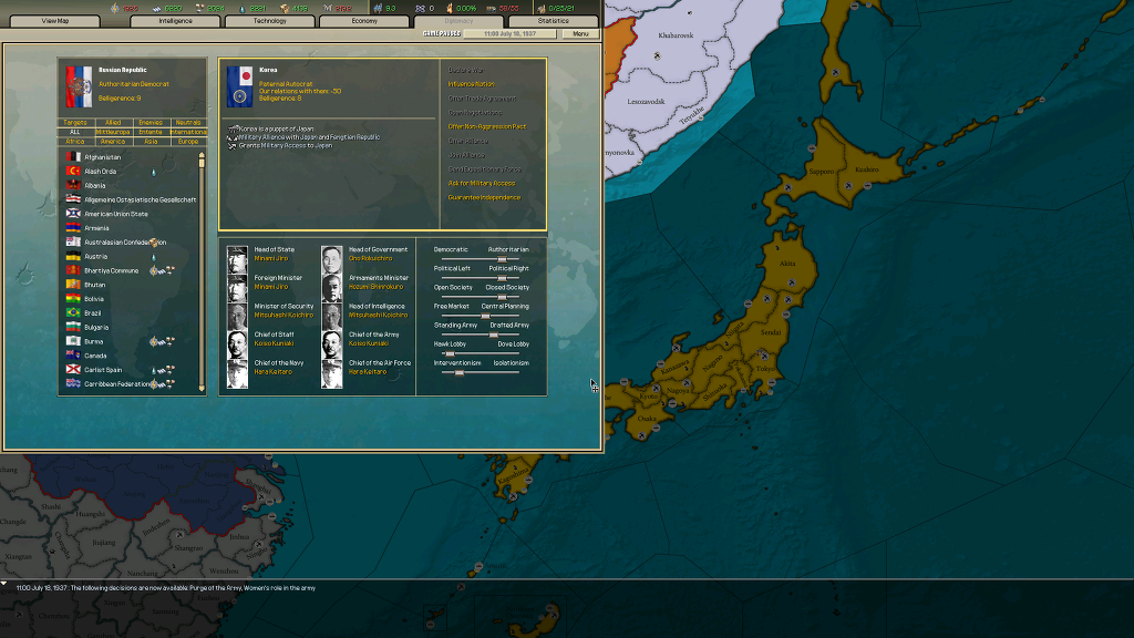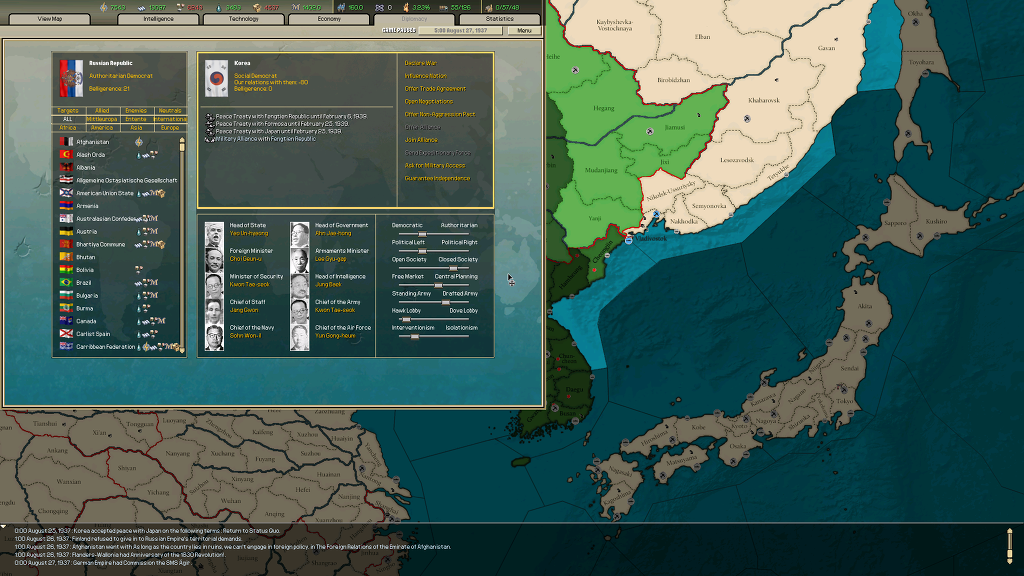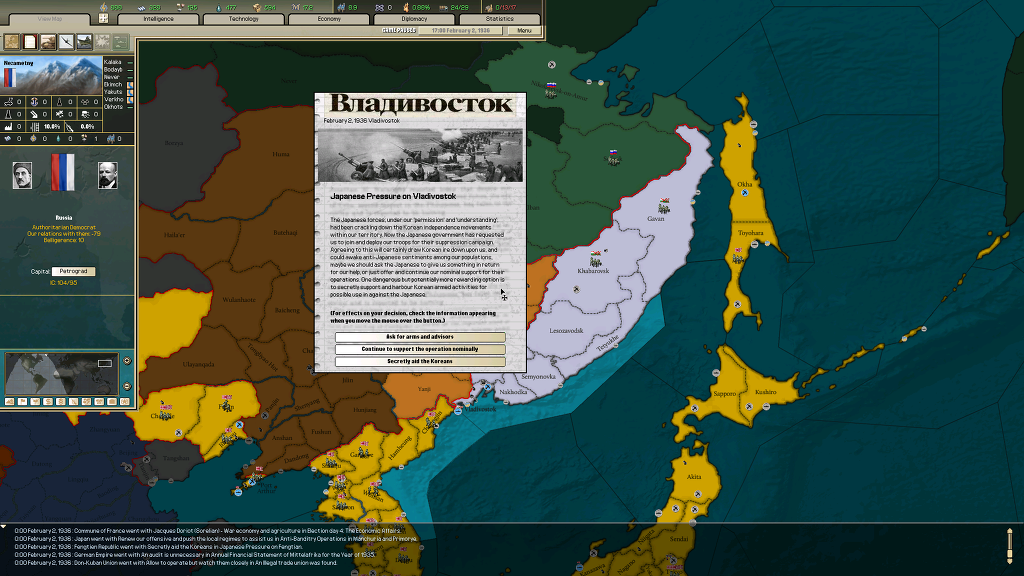 여튼 처음엔 일본의 괴뢰국인 상태인 트란스 아무르로 함 플레이 해보는데 여기서 한국 독립군들을 어떻게 하냐라는 이벤트가 나옵니다.(여기서 병력 지원을 약속하고 독립군 토벌하는데에 지원할 지 아니면 현상유지하거나 여기서 독립군들을 몰래 지원할 지 고를 수 있더군요)(독립군 토벌할 경우 남만주와 연해주 일부에 반군 터지는걸로 나오고)