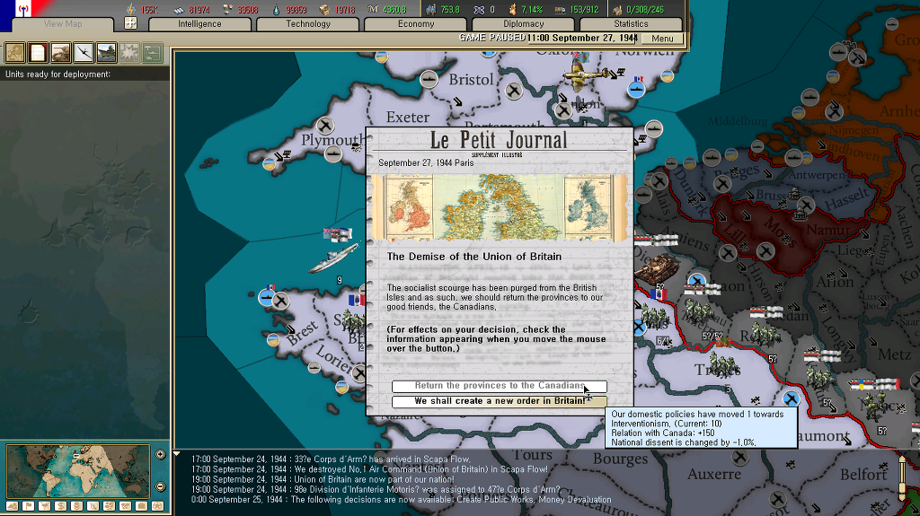 캐나다에 브리튼 본토를 돌려주는 이벤트를 가면 불만도를 줄이지만, 프랑스가 통수치고 냅더적하고 괴뢰국을 세우면 불만도가 오릅니다. 왜??