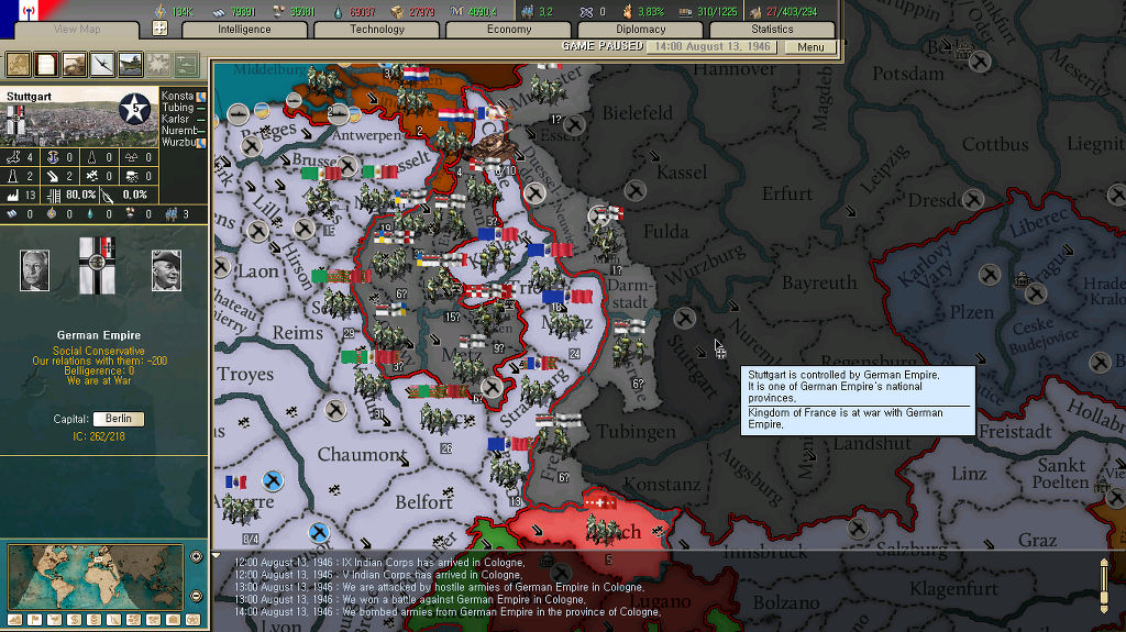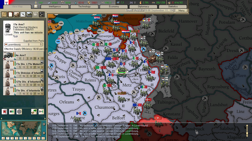 이후 독일에 선전포고 합니다. 독일 AI에 문제가 있는 지는 몰라도 요로코롬 포위해서 섬멸해주면 순삭 당합니다. 사실 이전에도 동맹군은 한 80개 사단 정도 날아간 상태인데 여기서 이렇게 되었으니 그냥 끗!