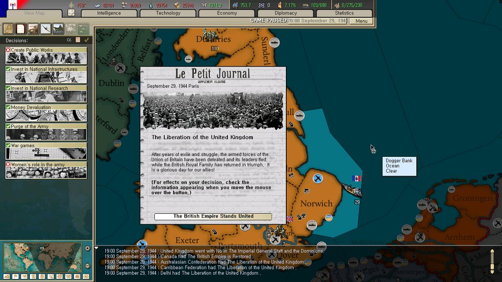 수년에 걸친 탈출과 투쟁 끝에 우리의 군대는 브리튼 연합을 패퇴 시켰으며 그들 지도자는 도망쳤습니다. 영국 왕실은 환희 속에서 복귀하였습니다. 오늘은 우리 동맹들에 영광스러운 날입니다!