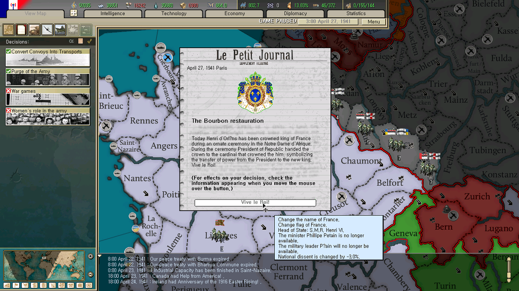 강려크한 능력치를 가진 페탱 형님이 가시고, 또한 마찬가지로 강려크한 정부수반인 자냉 장군도 물러가버리고 옹립되는 앙리 6세는 불만도나 줄이고 다니는 잉여입니다. 평소에라면 차라리 나폴레옹 4세를 고르거나 페탱 형님(이후 플랑댕)으로 가지만 위에서도 설명했듯 독일의 호전도가 0을 찍어버려서 공화정으론 선전포고 하기가 매우 힘들어진지라 어쩔 수 없는 선택.
