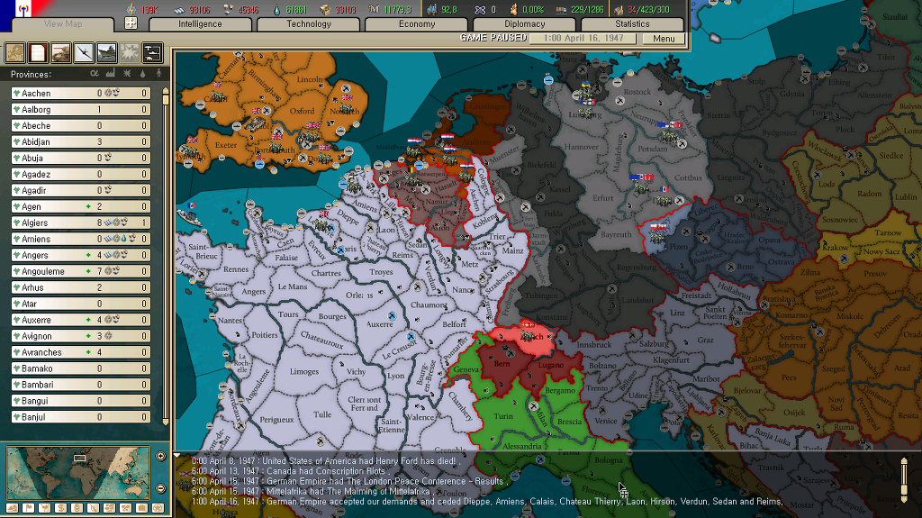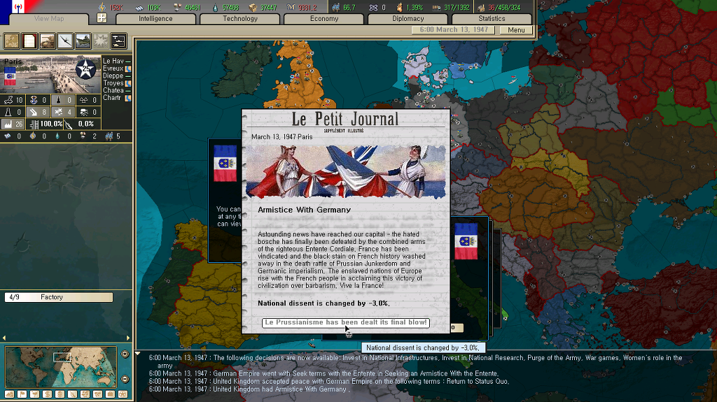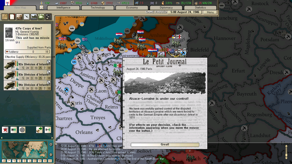 자세히 보면 룩셈부르크가 그대로 독일 땅인데, 이게 좀 골 때리는 게 코뮌-독일 전쟁에서 독일이 점령했던 영토는 조약 체결 후에도 여전히 독일이 점거하고 있습니다(...) 상당히 골 때리는 상황이긴 한데 게임상에서 남부 프랑스를 수복하여 마르세유에 수도를 박는 이벤트가 있는 걸 보면 모드 제작자는 파리를 점령 못했다가 나중에 파리에 세워진 독일의 괴뢰국을 밀어버리는 상황만 생각했던 탓인 것 같긴 하네요. 그도 아니면 게임 시스템상의 문제이거나. 애초에 조약이 체결되면 저 땅을 포함하여 프랑스의 국민지역을 전부 토해내는 걸로 설정해놨으면 얼마나 좋아...