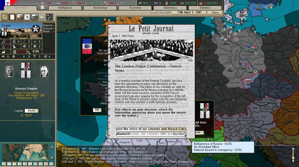 이렇게 현실에서 푸앵카레가 원했듯 알자스-로렌, 식민지에다 라인란트까지 뜯을 수 있습니다. 뭐 식민지라 해봐야 중앙 아프리카의 약간에다가 정작 베트남은 그대로 독일에 남아 있는 뭔가 비합리적인 모습이 꽤 보이지만요.