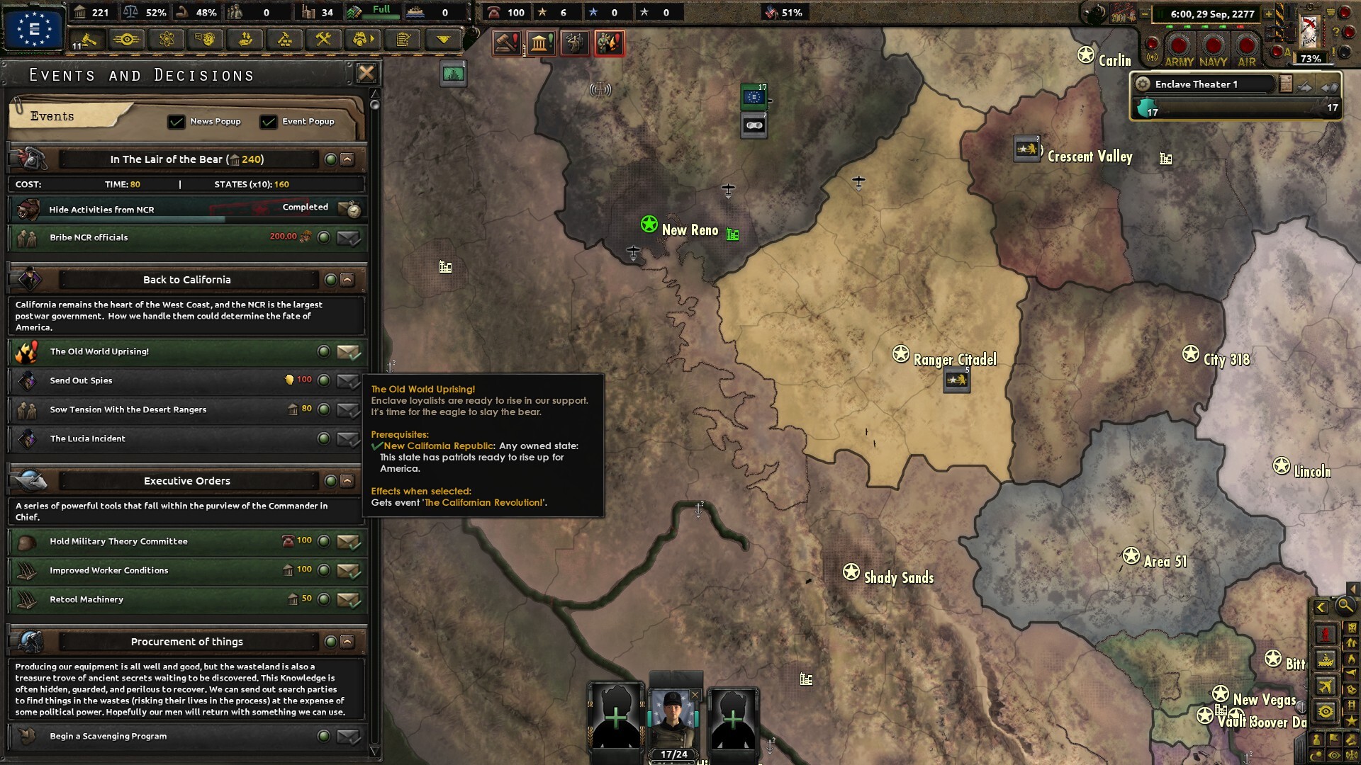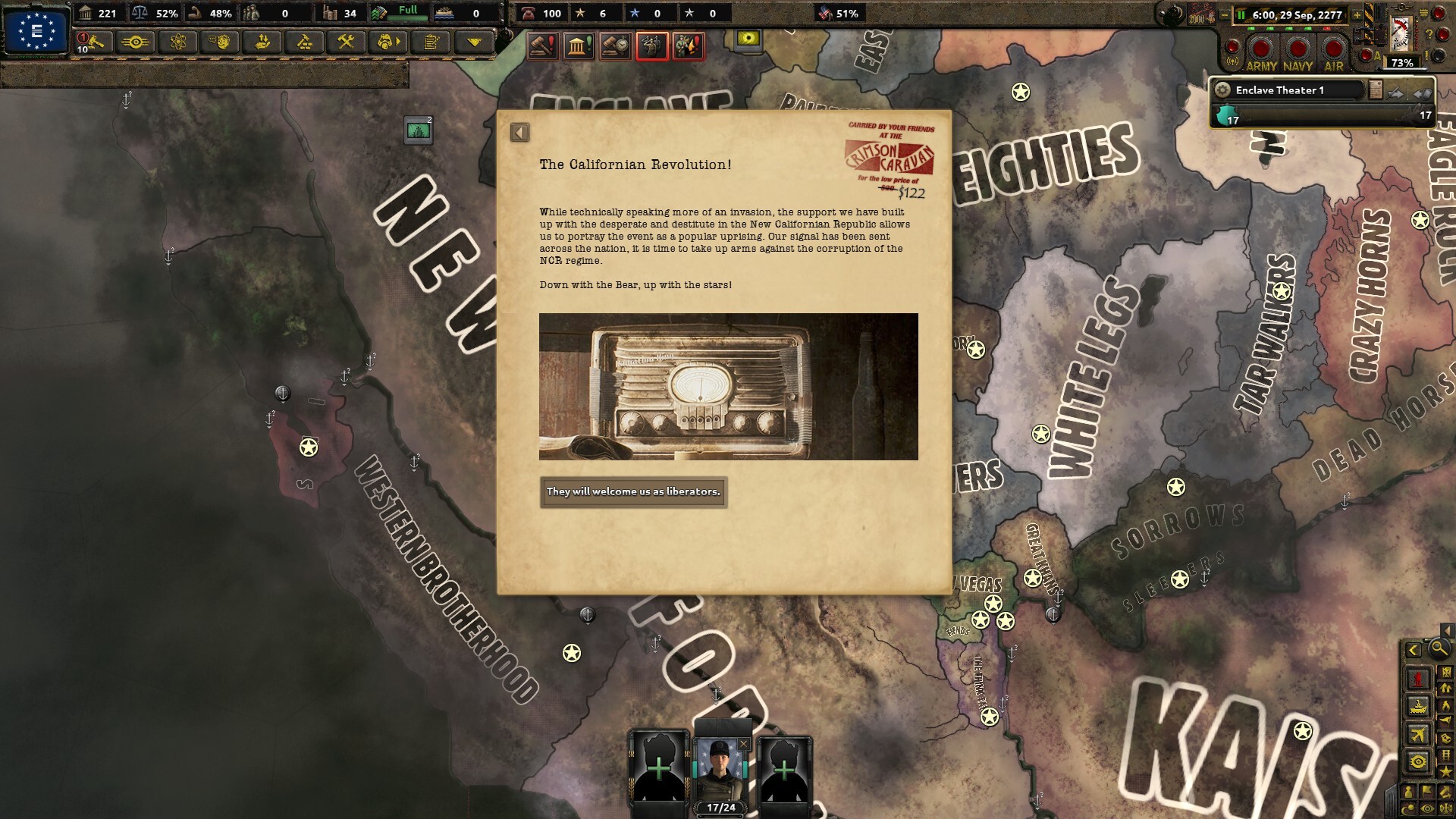 부패한 NCR의 분노한 인민들을 설득한 엔클레이브는 괴뢰집단을 뒤엎는 혁명을 일으킨다