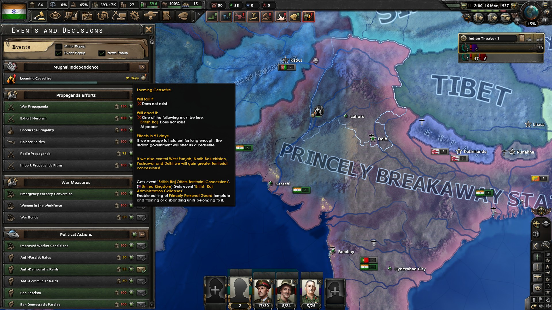 안그래도 영국 포함 영연방이 전부 참전해서 짜증나는데 어떻게든 영국령인도,영국령 버마 다 항복 받아냈는데도 저상대로 시간 지나면 고작 얻는게 펀자브,카슈미르,델리 얻고 끝 다른조건은 주요국 항복시키고 영국령 인도 합병해서 존재하질 않아야하는거니