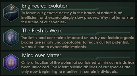 Finally there are the three 'Species Endgame' paths: The biological path, the spiritual path and the synthetic path. These three paths each consist of two perks, the first of which unlocks access to the second once a number of other pre-requisites have been met. The paths are mutually exclusive, and once you start heading down one of them, the other two are locked off.