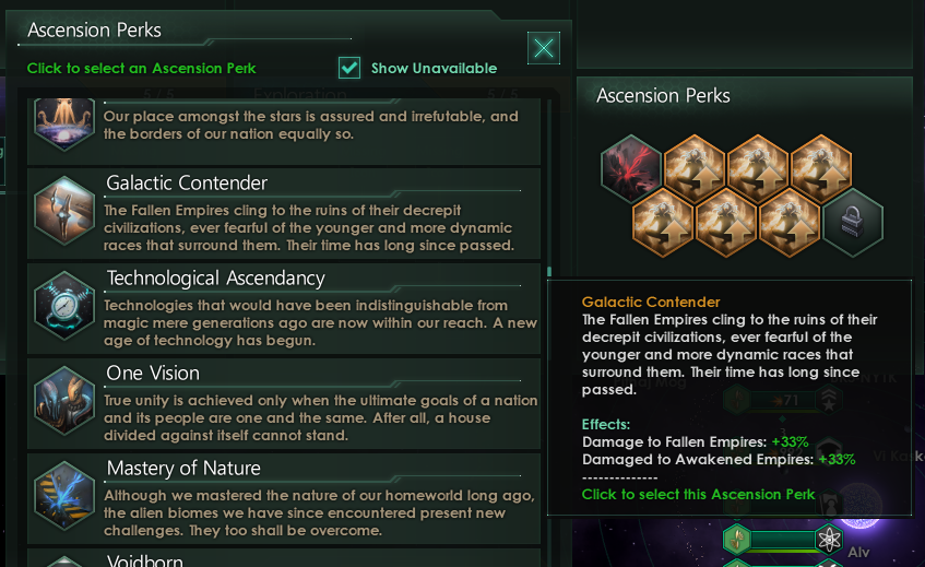 The idea behind the Ascension Perks is to provide more unique unlockable features for Empires, and to provide the player with the ability to determine an 'endgame' for their species: What their empire is striving towards. Perhaps your goal is to go all-in on AI, replacing the frail biological bodies of your pops with immortal machines, or to harness the psionic potential of your species and reach a higher form of existence, allowing your empire to tap into other planes of being? All these and more are covered by the Ascension Perk system.