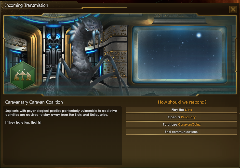 대상 코인은 게임을 즐길 기회를 제공하거나 혹은 루트 박스를 살수 있습니다. 누가 아나요, 운빨이 엄청나게 좋아서 알려진 은하계에서 매우 화려하면서 값어치 있는것으로 평가되는 갤러트론(Galatron)같은 것이 걸릴지 말이죠.