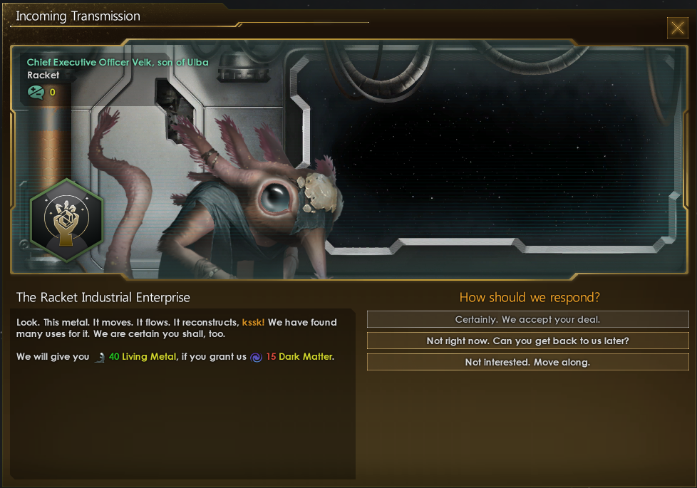 일찍이 말한대로, 그들은 3개의 함대를 가지고 있으며, 라켓 인더스트리 엔터프라이즈, 누미스틱 오더, 그리고 벤갈리안 트리움으로 알려져 있습니다(Racket Industrial Enterprise, the Numistic Order, and