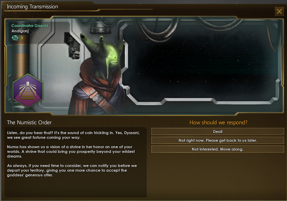 대상들은 은하간을 돌아다니는 우주 기반의 상인들로 좋은 거래를 제공합니다! 이들은 Chor's Compass에 있는 연합 기지에서의 3개의 서로 다른 다른 대상 함대로 구성됩니다.