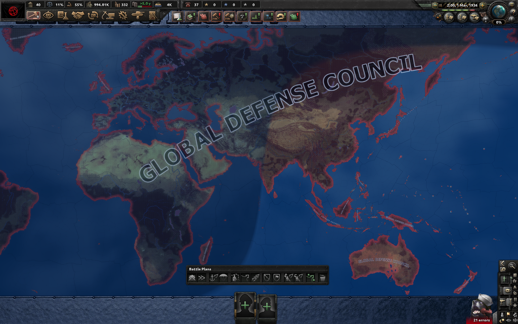 스탈린주의의 압력에 굴복하고, 민주적 원칙을 희생하더라도 파시즘을 물리치는 데 집중할 수도 있어. 만약에 이 선택을 한다면 정부는 공산주의로 전향하게 되고, 이 이후에 독립전쟁은 불가능하지. 대신 스탈린주의 측면에서 자치권 강화를 호소하여 꼭두각시보다는 코민테른의 본격적인 일원이 될거야. 민주주의 트리의 남은 포커스는 육해군 재건과 세계적인 반-파시스트 십자군 준비지.
