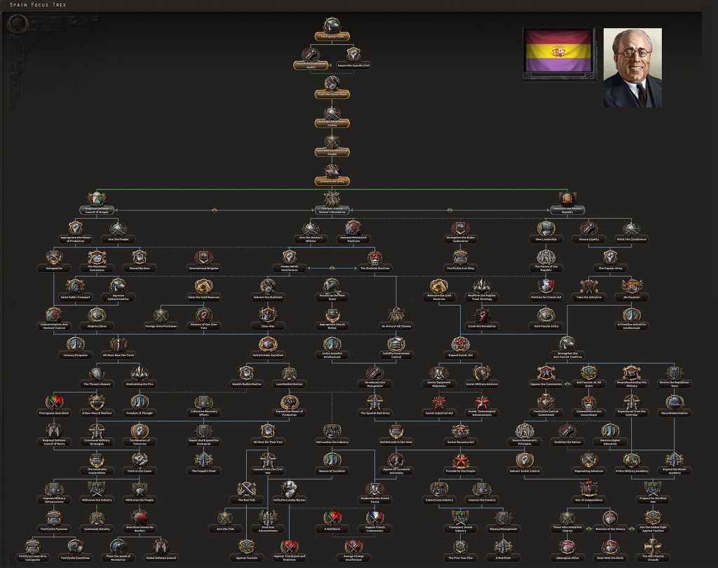 스탈린주의자들에게 소련의 원조는 훨씬 쉬운 일이 아니야. 그래 넌 괴뢰국이 될거야. 하지만, 너의 가장 강한 포커스들이 어쨌든 이 지점과 연결되어 있지. 항상 자치도를 올릴 수 있게 간청할 수도 있어. 내전이 끝난 후, 이 루트는 스페인과 소련 사이에 위치한 파시즘 국가들과 양면전선을 펼칠 수 있는 방벽으로서 나라를 요새화 시키는데 중점을 두고 있지. 마지막으로 프랑스 공산주의자에 대한 지원, 포르투칼 정복, 내전 동안 국민파편으로 의용군을 보낸 나라들에게 복수를 강요하는 포커스들이 있어.