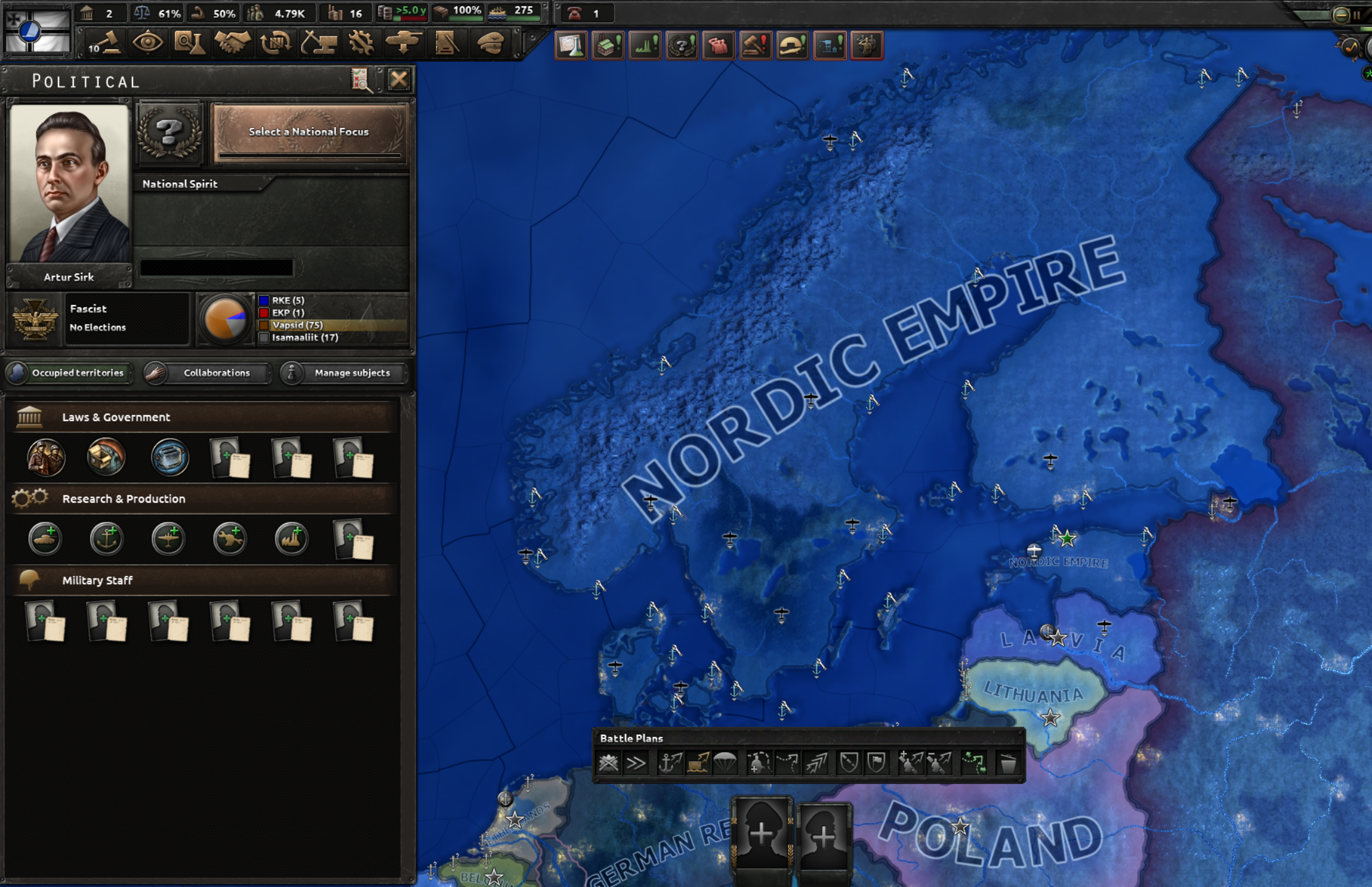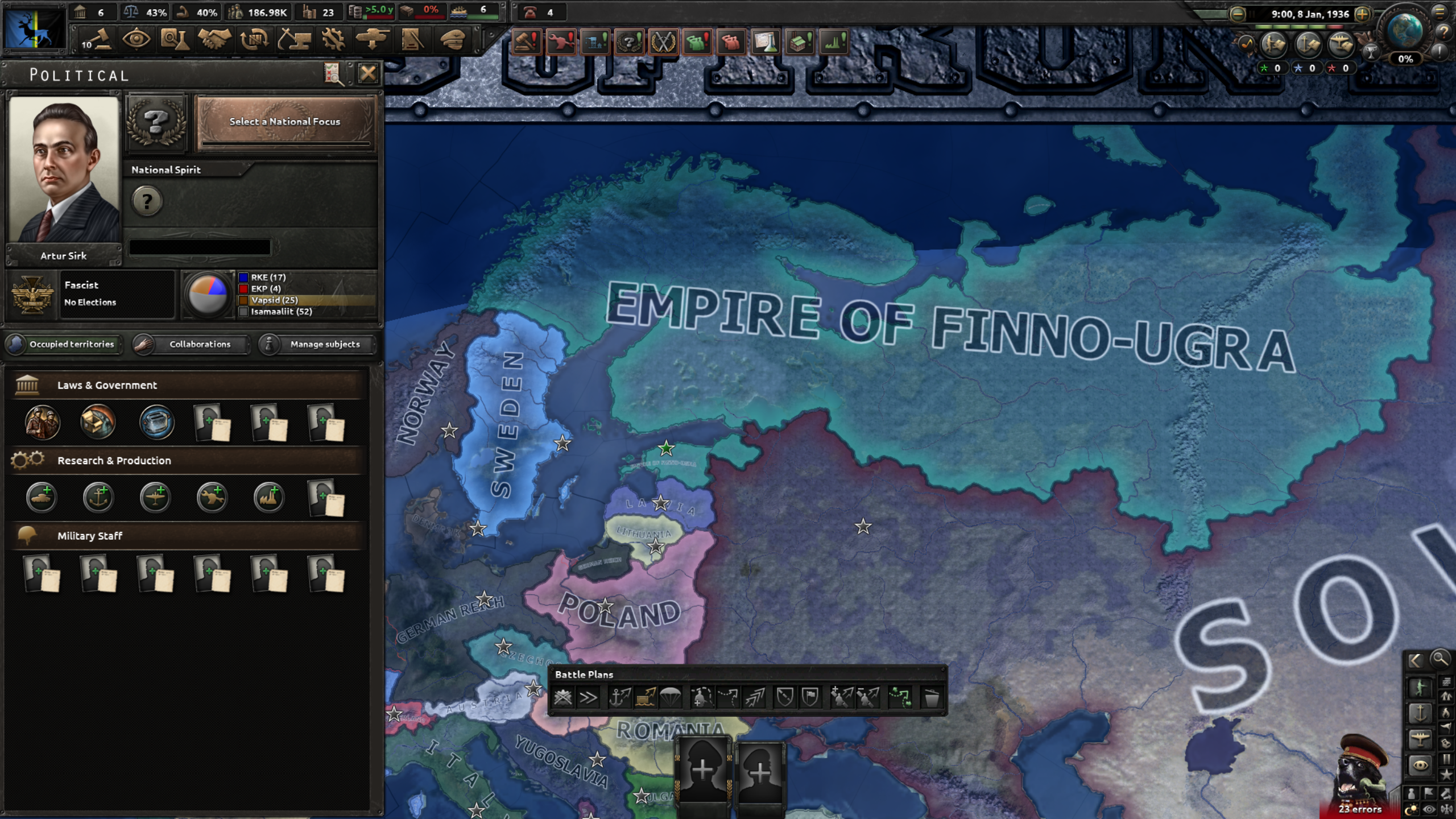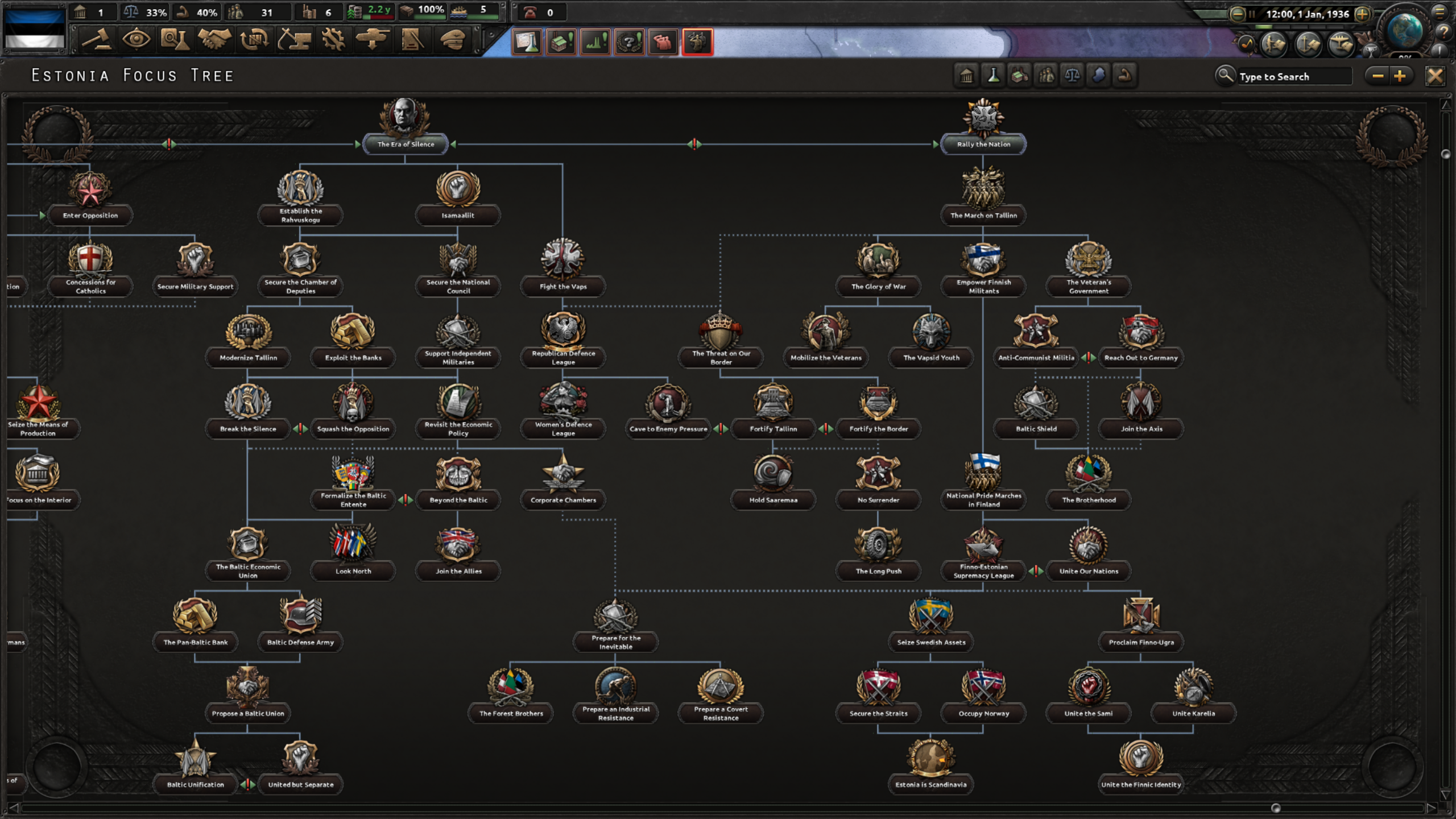 국가 재편성: 파시즘 트리. 중간에 추축국에 가입하거나 독자노선을 택할지 정한 뒤, 북유럽 정체성이나 핀우랄 정체성 중 하나를 고르게 되는데, 북유럽을 고르면 노르딕 연합을 만드는 조건에 접근할 수 있으며 핀우랄 정체성은 핀란드, 사미, 카렐리아를 포함한 핀우랄 지역에 영유권과 핵심주를 받음