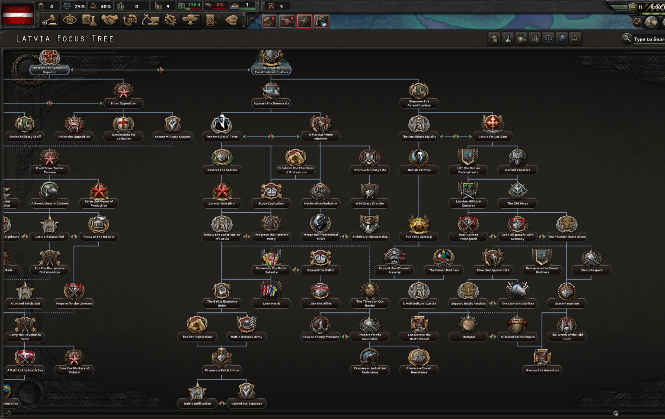 민주주의or파시즘: 파시즘을 탄압하고 민주주의자를 지원하거나, 반대로 파시즘 세력인 천둥십자단을 지원해서 라트비아에 파시즘을 도입하게 됨. 반독 트리는 발트 국가에 파시즘을 전파하며 친독 트리는 발트 3국+벨라루스를 합친 친독 위성국 오스트란트(오스틀란트)를 만들 수 있음. 독자노선은 발트 통합 후 신이교 운동을 통해 발트 종교를 부활시킴