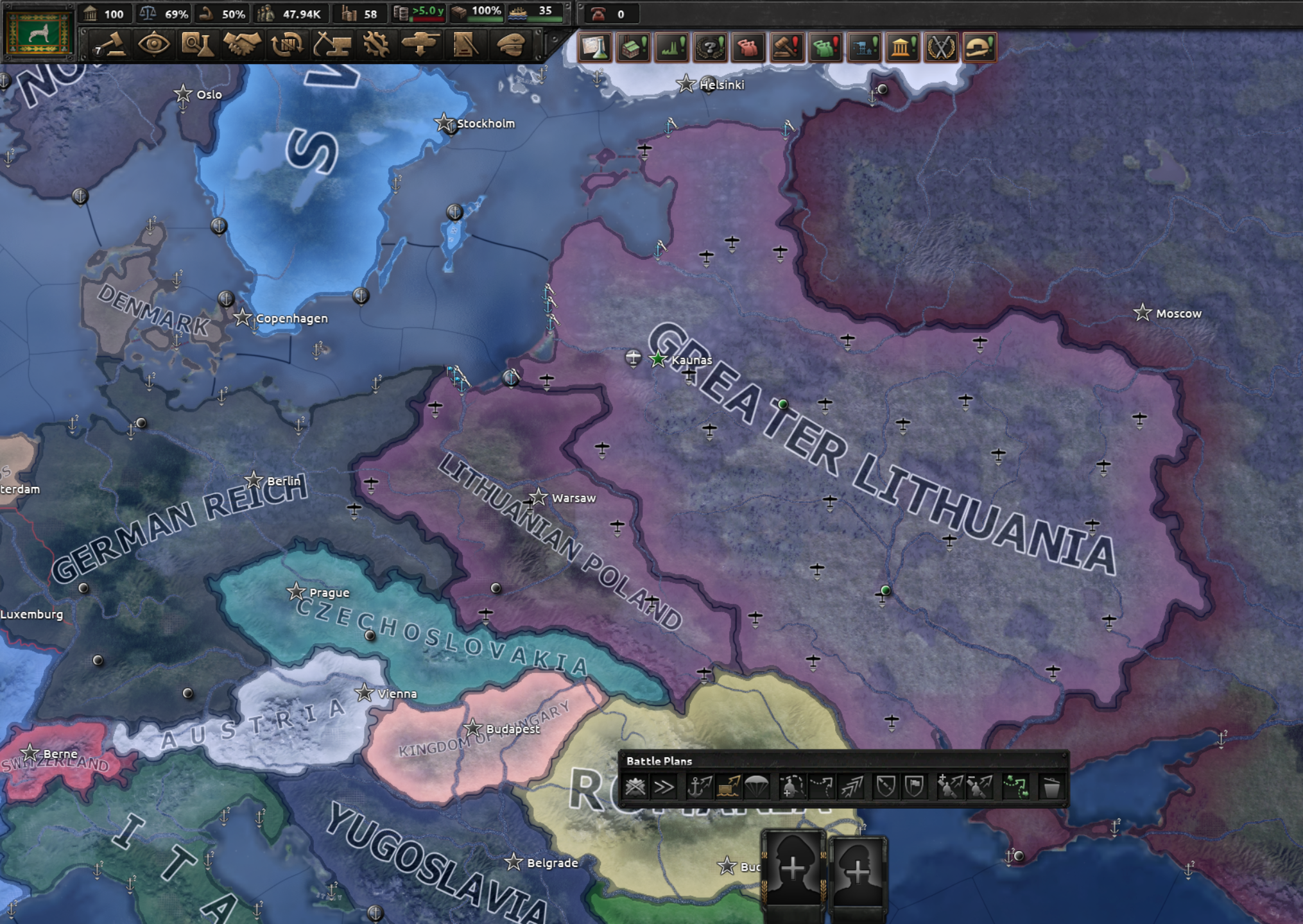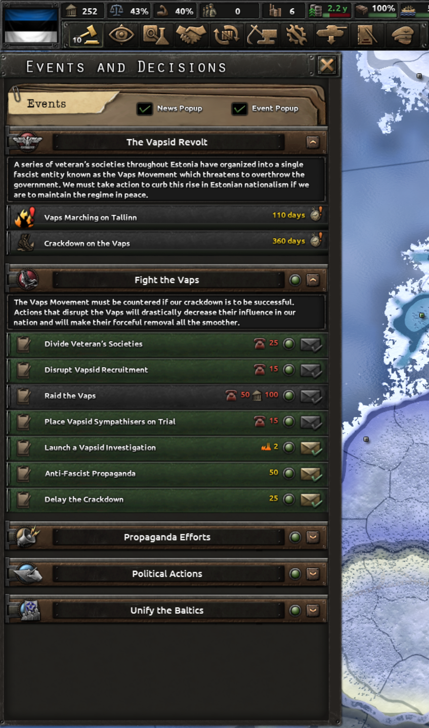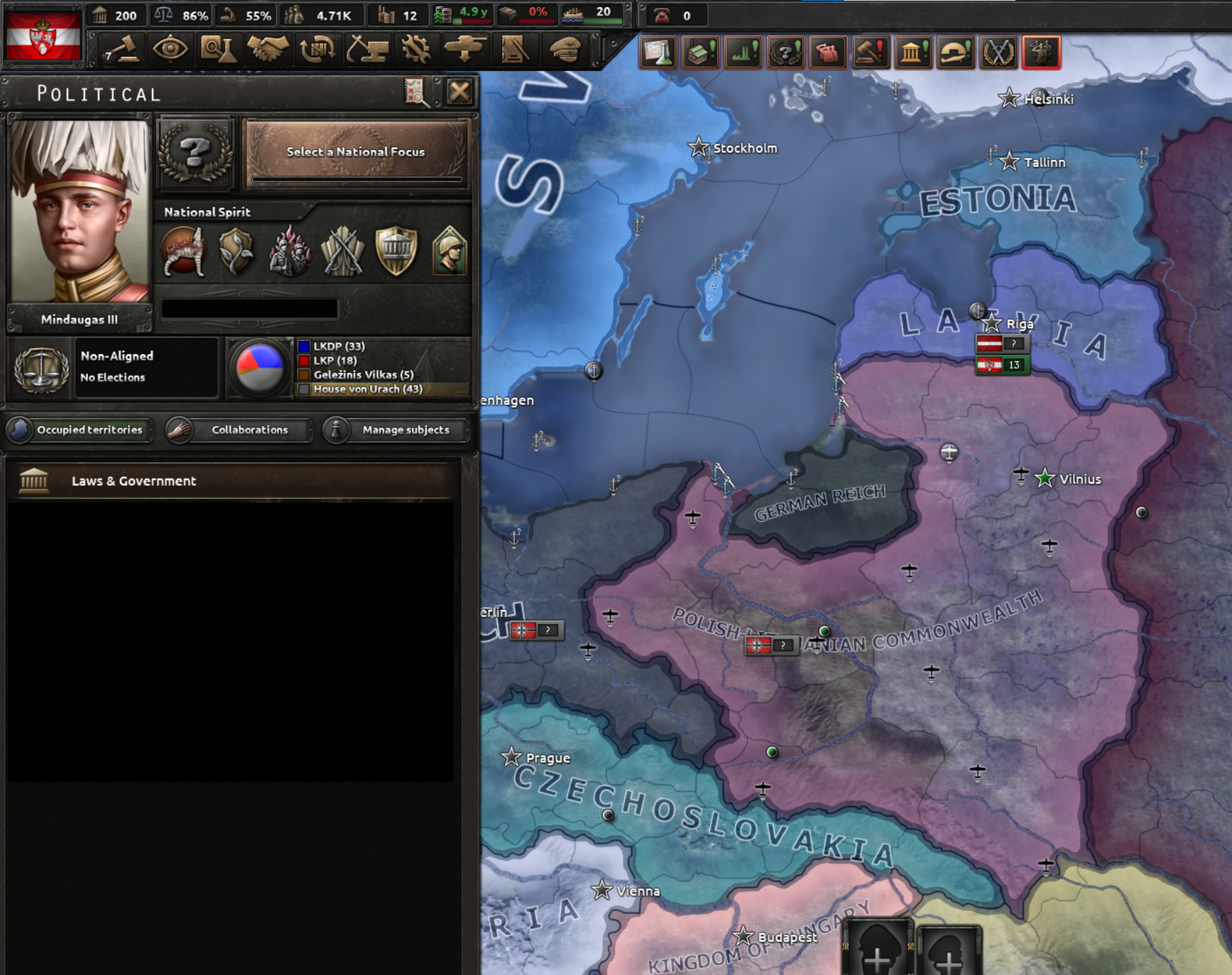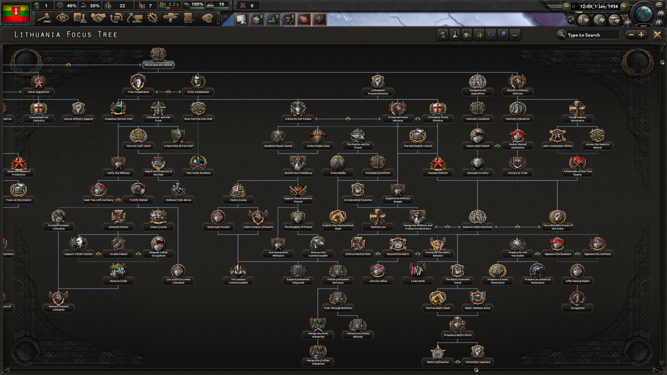 국내외 정치 1: 당시 대통령이던 스메토나의 정적인 볼데마라스에 대한 처우를 석방or연금 지속 중에서 결정하게 됨. 실제 역사에서 볼데마라스는 연금 후 프랑스로 망명함. 볼데마라스를 석방하면 파시즘 정당인 강철늑대를 지원하며 추방하면 탄압함. 그 후 클라이페다(메멜)을 대가로 독일과 동맹을 맺고 빌뉴스 수복을 목표로 삼는 동시에 리투아니아의 전성기 영토 수복을 노릴 수 있게 됨