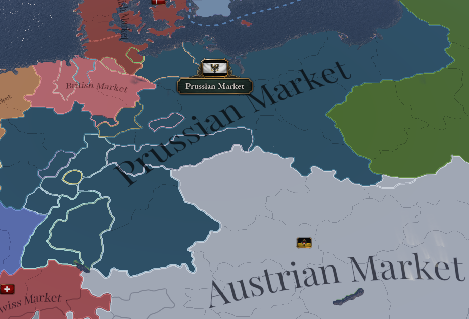 A. 개발 초기에는 같은 나라 안에서도 여러 개의 시장이 존재할 수 있도록 다양한 시도를 해보았지만 어떤 방식으로도 만족스런 결과를 내지 못 했음. 모든 시장에서의 거래를 추적하고 시장 간의 상품 이동을 관리하는 것은 다른 무엇보다도 더욱 번거로운 일이었으며 그러한 방식을 통해 국가의 경제상황 전반을 이해하기가 매우 어려웠음. 국가 당 하나의 시장을 배치함으로써 더 나은 플레이를 시도할 수 있고 시장에서 취해야 할 조치에 대한 결과를 더 쉽게 이해할 수 있음. 그렇지만 앞서 얘기한 문제들이 발생하지 않는다는 전제 하에 식민지 시장과 같은 특수한 경우도 완전히 배제하지는 않았음.