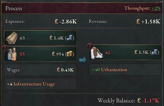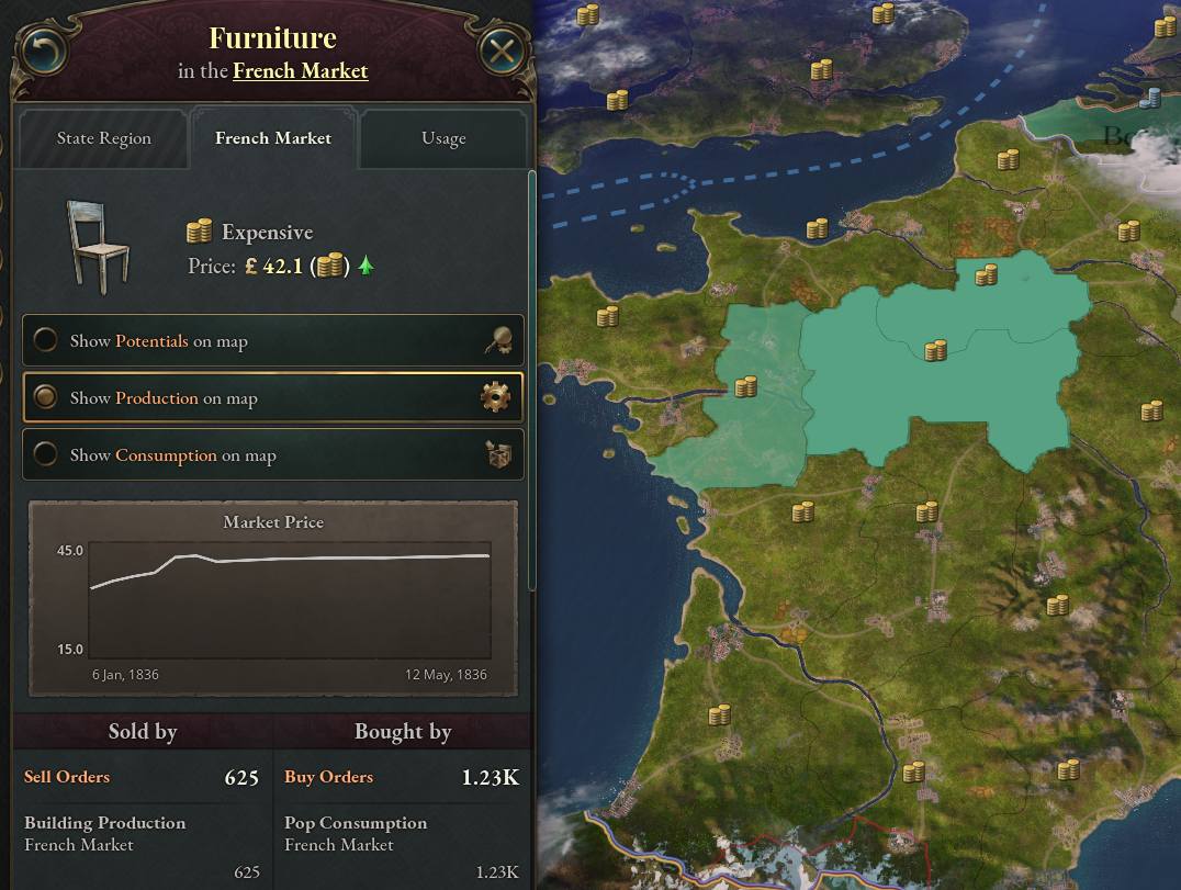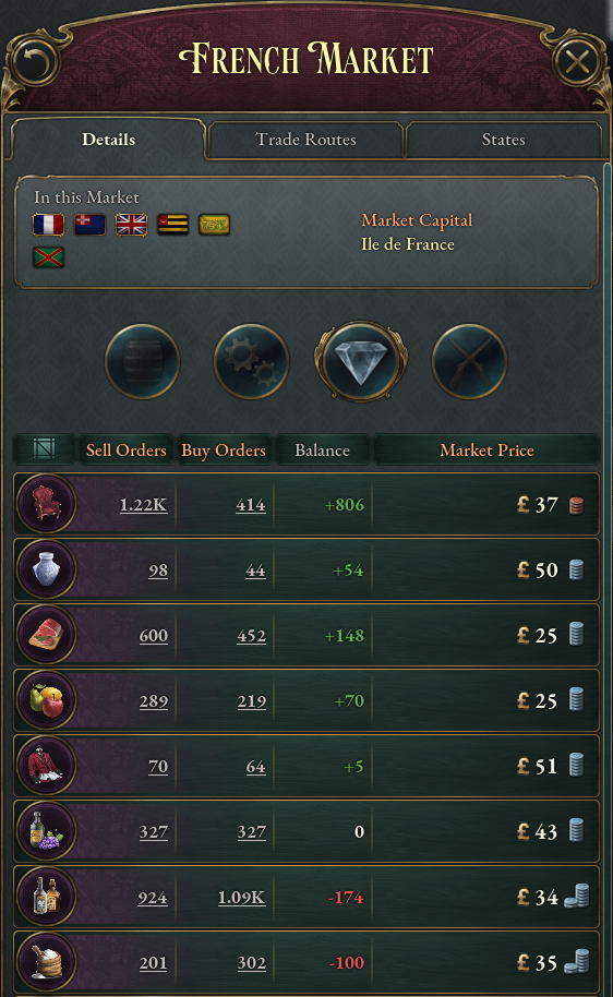 프랑스 시장은 저렴한 고급가구, 도자기, 과일, 육류들이 넘쳐남. 고급의류와 와인 또한 적정수준으로 공급되고 있지만 사치품은 사치품일 뿐. 특히 설탕은 공급량이 상당히 부족하므로 안정적인 공급원을 확보한다면 증류주의 공급도 개선될 것