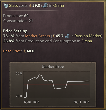 (아래의 스샷 참고) 오르샤(게임에서는 러시아 지역, 현실에서는 벨라루스 영토)는 유리를 과잉생산하고있음. 이는 오르샤의 시장 접근성과 연계되어 해당 지역의 유리공장이 시장 가격과 비슷한 수준으로 유리를 판매할 수 없게 되는 결과를 낳음. 이렇게 되면 시장 가격보다 저렴한 유리를 구할 수 있는 현지 팝이나 도심지 건물에는 좋겠지만, 이런 상태로 유리공장을 계속 확장하면 그 지역의 모든 산업들의 시장 접근성이 악화되고, 이에 따라 어디에서도 유리를 현재보다 비싸게 팔지 못 하게 되어 유리 판매량이 감소하게 될 것임. 아래의 차트를 보면 공급량의 부족으로 인해 유리의 시장 가격이 높아질 무렵 오르샤의 유리공장이 확장되면서 가격이 떨어졌다가, 성과를 보지 못 하자 다시 높아지기 시작함. 최근 몇 차례의 공장 확장으로 현지 가격은 꾸준히 떨어지고 있지만 시장 가격의 하락에는 아무런 영향을 미치지 못 함.