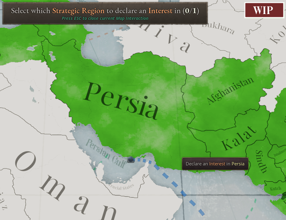이익 선포(Declared Interest)는 해당 권역에 영토나 종속국을 보유하지 않아도 그 지역에 이익을 주장할 수 있는 기능임. 식민지 개척을 계획하거나 경쟁국의 확장을 막기 위해 사용하는데, 이미 이익이 존재하는 권역과 인접하거나 해상 보급망(자세한건 다음에 소개)을 통해 도달이 가능한 모든 권역에 선포할 수 있음. 국가의 등급에 따라 선포할 수 있는 이익의 개수가 다르므로 강대국일수록 더 넒은 영토를 통해 더 많은 지역에 이익을 선포할 수 있음.