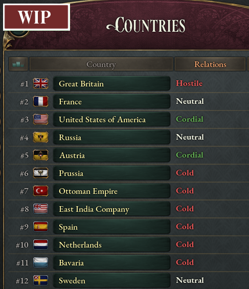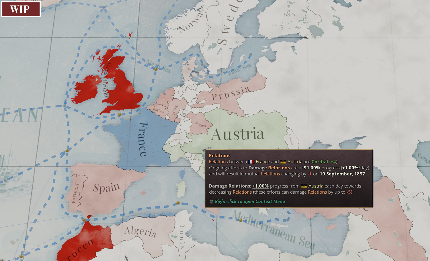 A. 관계도는 두 나라가 서로를 대하는 공식적인 외교적 입장을 나타냄. 외교적 행동이나 이벤트 등으로 조절할 수 있으며 AI든 플레이어든 대상 국가에 어떤 행동을 취할 수 있는지에 영향을 미침. 태도는 AI가 플레이어에게 어떤 행동을 취할 것인지를 폭넓게 알려줌. 관계도를 포함한 많은 요인들에 기초하지만 태도 그 자체는 AI의 의사결정에만 영향을 미침.