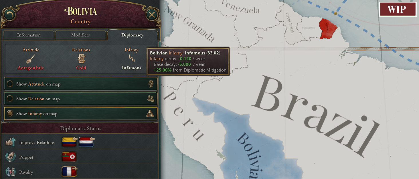 여기까지만 보면 빅토2와 다를게 없어 보이지만, 전작과 이 게임의 결정적인 차이점은 악명이 외교적 분쟁(Diplomatic Incident)과 연관된다는 것임. 외교적으로 영토를 요구하거나 전쟁 중 중립국의 주권을 침해하는 등의 행동은 악명을 높일 뿐만 아니라 지도 상의 특정 전략적 권역에서 발생하는 외교적 분쟁을 발생시킴. 외교적 분쟁이 발생하면 분쟁을 일으킨 나라는 해당 분쟁으로 인해 발생한 악명의 양만큼 관계도를 상실하는 등 그 권역에 이해관계를 가진 모든 나라와의 관계에 즉각적인 페널티를 받음.