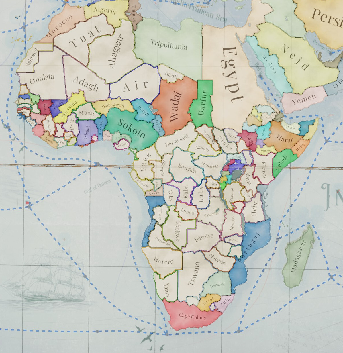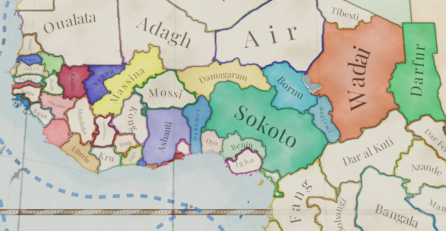 서아프리카는 이 게임이 처음 계획되었을 때부터 많은 디자인적 결정이 있었던 지역임. 위에서도 얘기했지만 빅토2의 지도를 바탕으로 작업이 이루어졌기 때문에 가장 먼저 했던 일은 지도 상의 모든 곳에 어떠한 객체를 만드는 것이었음. 서아프리카의 초기 구상안은 수정에 수정에 수정이 더해졌고 어쩌면 앞으로도 계속해서 수정이 필요할 것임. 아샨티처럼 처음에는 분권형 국가였다가 플레이 가능한 국가*로 바뀐 나라들도 있고, 국가 추가와 명칭 변경도 우리 개발진들이 자료 조사와 연구에 시간을 투자하고 유저들의 피드백에 귀기울이는 이상 과거에도 그랬듯 앞으로도 지속적으로 이루어질 것임.