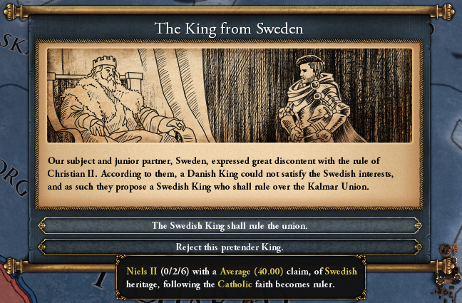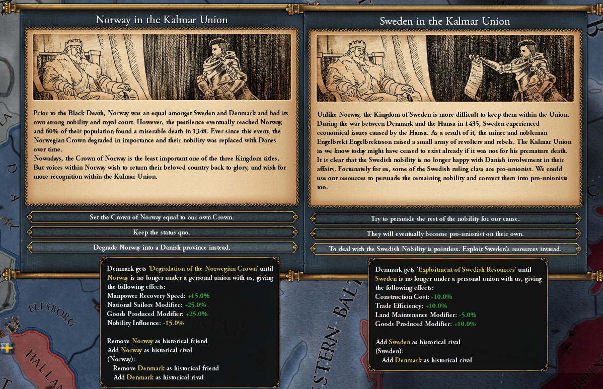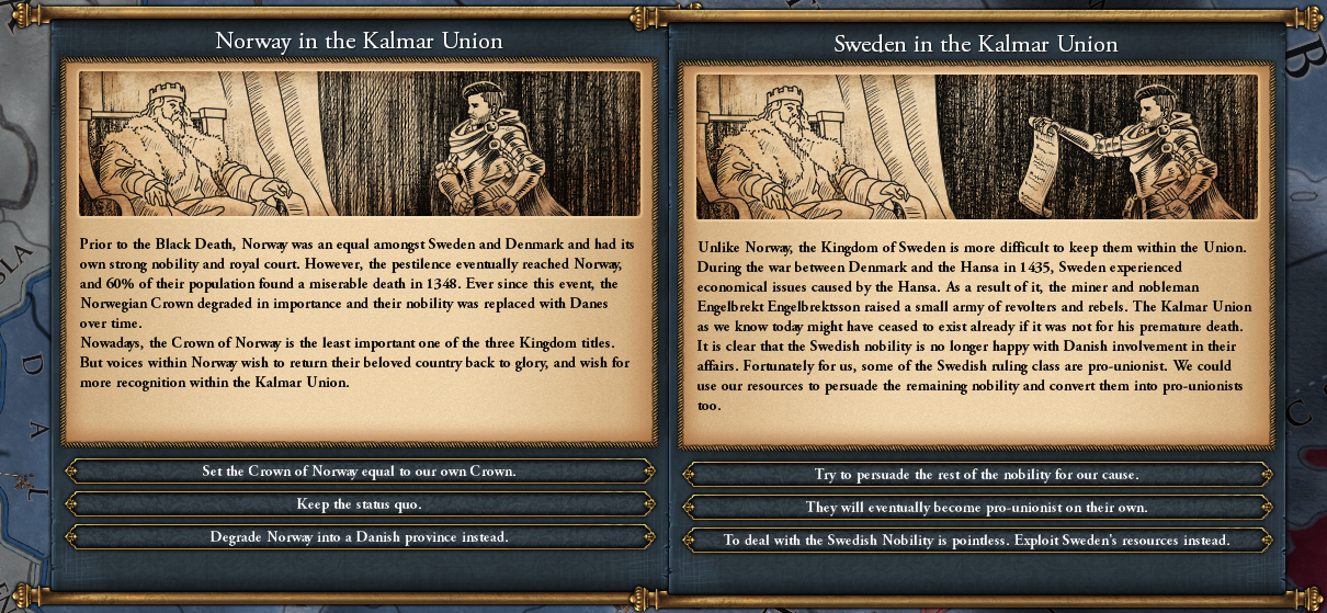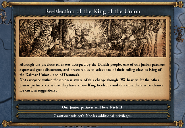 여러분도 아셨다싶이 스웨덴과 노르웨이는 세속 군주제가 아닌 선거 군주제였습니다. 그래서 덴마크로 플레이할 때 칼마르 연방 정부개혁을 보유한 채 여러분의 왕이 사망하면 다음 이벤트를 얻습니다: