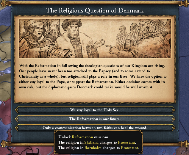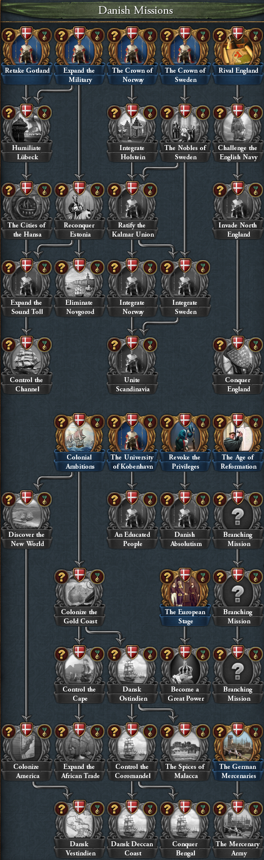 그러나 결국에는, 칼마르 연방은 스웨덴이 덴마크에게서 해방되었을 때 붕괴되었으며 스웨덴은 이후 자기들의 제국을 세웠습니다. 덴마크 임무 트리의 목표는 이 운명을 피하는 것입니다. 또한 임무 트리는 EU4 시기에 덴마크가 가졌던 야망들에 집중하며 따라서 튜튼이나 리보니아 기사단의 임무 트리보다는 덜 실험적입니다.