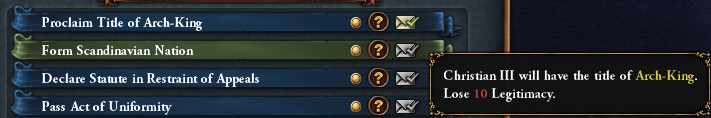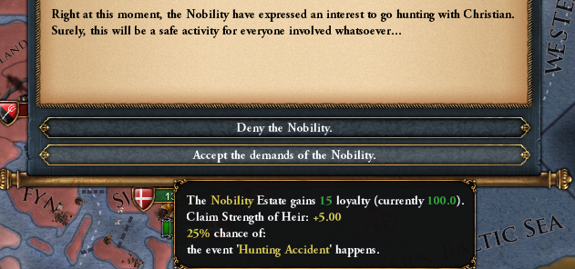 선택지 1번: 덴마크 왕을 우리의 왕으로 선출 - 덴마크 위신 10, 정통성 5 획득. 서로에 대한 관계도 +25