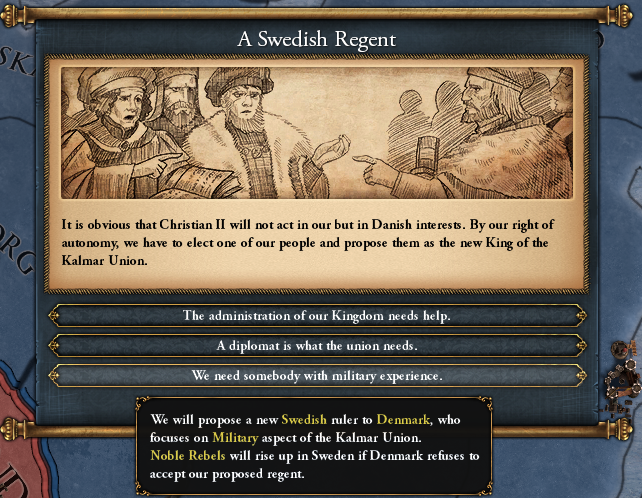선택지 1번: 행정, 2번: 외교, 3번: 군사에 집중한 스웨덴 출신 통치자를 덴마크에게 제안. 덴마크가 거절 시 귀족 반군 발생.