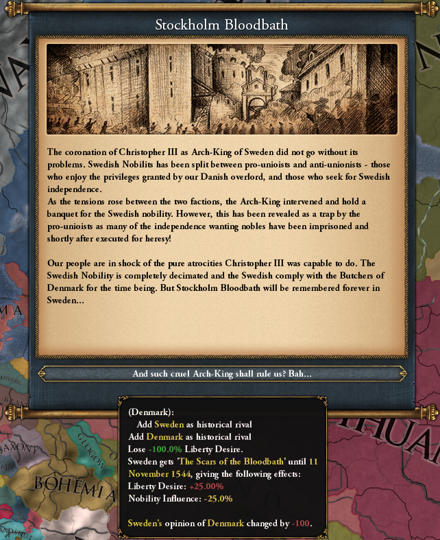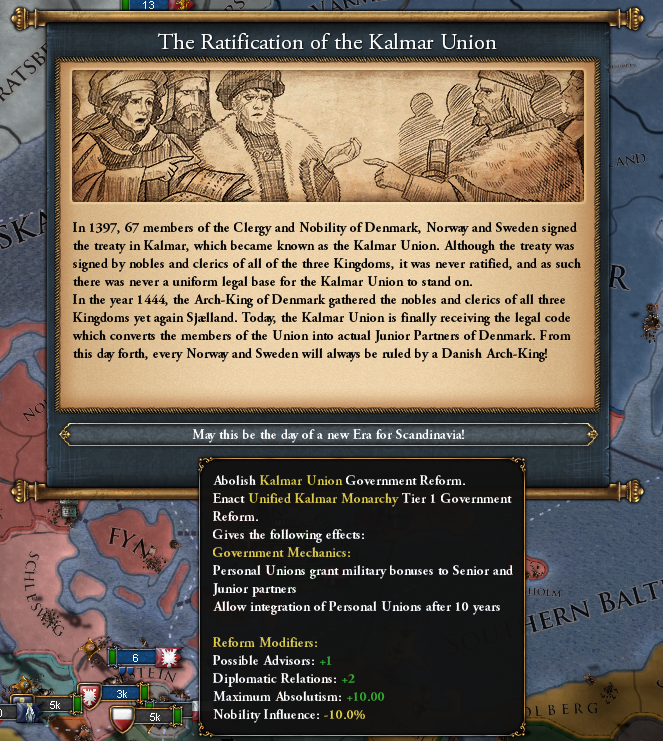 (전투에서 패배시키든 스톡홀름에서 처형시키든) 스웨덴 귀족들을 처리한 뒤, "칼마르 연방 비준" 임무에 착수할 수 있으며 완료 시 다음 이벤트가 발생합니다: