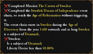 이 미션은 중장기간의 이벤트 체인에 관한 것이며 (이 체인에 기존에 있던 덴마크/스웨덴 이벤트의 일부도 통합되었습니다), 스웨덴의 귀족들을 어떻게 처리할지 선택할 수 있습니다. 요약하자면 이 이벤트 체인의 두 가지 가능한 결과를 보여드리죠.
