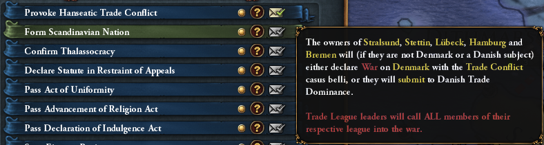 가장 좌측의 임무들은 덴마크가 마주한 더 중요한 적들에 대한 염려를 담고 있습니다: 바로 한자 동맹입니다. 커뮤니티는 이미 이번 DLC에서 뤼벡 상인 공화국이 얼마나 불쌍하게 괴롭힘 당할지 얘기했었는데, 덴마크 임무 트리에서도 이 유행은 계속됩니다. "뤼벡 모욕하기" 임무는 다음 임무를 위해 매우 크게 필요한 결정을 해제해줍니다: