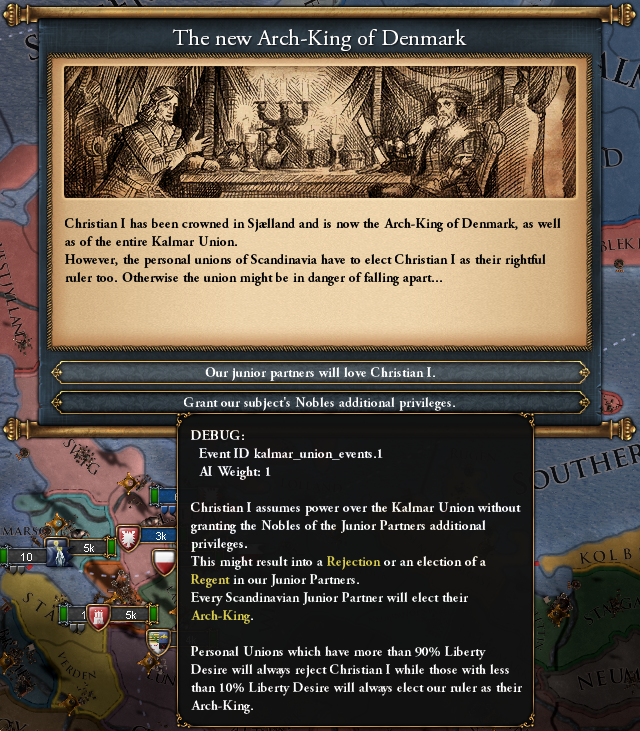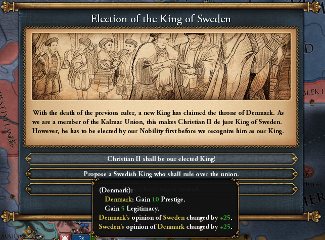 선거 이벤트의 선택지 1번, 3번은 무엇인지 설명이 비교적 되어있지만, 2번 선택지 같은 경우는 AI가 당신의 통치자에게 완전히 납득되지 않았지만 - 주로 통치자의 군주 능력이 부족할 경우 - 칼마르 연방에서 탈퇴하고 싶지는 않을 때 선택합니다. 이럴 경우, 동군연합 속국들은 자신들의 상류 계층들 중에 한 명을 덴마크의 왕으로 선출할 것을 제안할 수 있습니다: